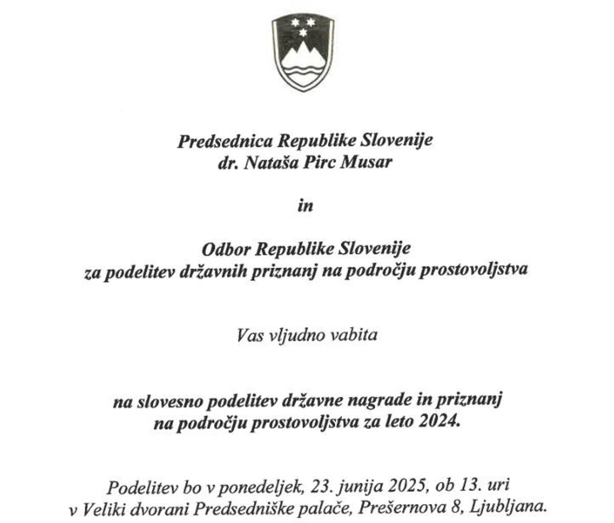 Predsednica Republike Slovenije Nataša Pirc Musar je 23. junija v Predsedniški palači priredila slovesnost ob podelitvi državne nagrade in priznanj za izjemne dosežke na področju prostovoljstva za leto 2024.