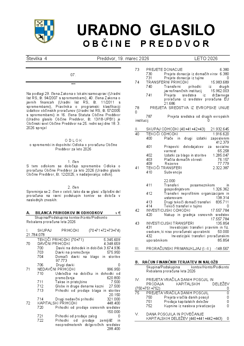 Odlok o spremembi in dopolnitvi odloka o proračunu občine Preddvor za leto 2026 (Uradno glasilo Občine Preddvor - številka 04/2026)