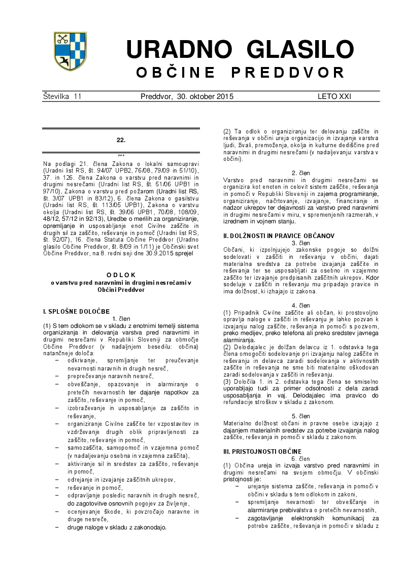Odlok o varstvu pred naravnimi in drugimi nesrečami v Občini Preddvor (Uradno glasilo Občine Preddvor – Številka 11/2015)