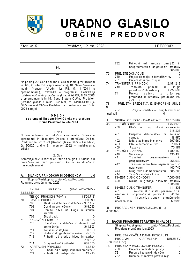 Odlok o spremembi in dopolnitvi Odloka o proračunu Občine Preddvor za leto 2023 (Uradno glasilo Občine Preddvor - Številka 5/2023)