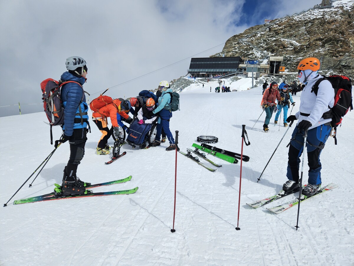S pomočjo srčnih prostovoljcev, ki so jih spremljali in jim pomagali potiskati vozičke preko ledenika, so se povzpeli vse do 3.900 metrov visoko. Pred tem so na vozičke namestili smuči, kar je bila prava inovacija! Tudi ekipa iz našega Športnega društva Preddvor je spremljala in skrbela za njihovo varno smuko do postaje kabinske žičnice na nadmorski višini 3.883 metrov. Pred nami se je razprostirala čudovita pokrajina, ki je vzbujala občutek svobode in pustolovščine, hkrati pa smo se zavedali, kako pomembno je imeti ob sebi podporo in ekipo, ki poskrbi, da je vsak trenutek varen in poln užitka.