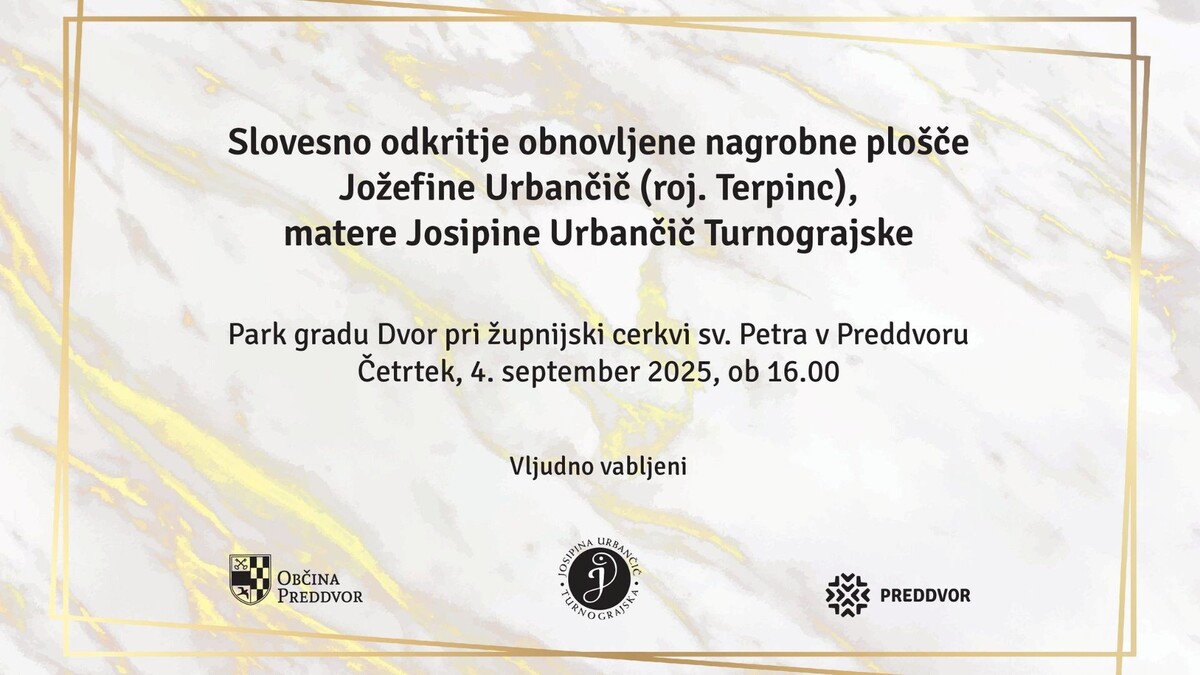 Kulturno društvo Josipine Turnograjske vas v sodelovanju z Občino Preddvor vabi na slovesno odkritje obnovljene nagrobne plošče matere Josipine Urbančič Turnograjske, ki bo potekalo v četrtek, 4. septembra, ob 16. uri v grajskem parku ob župnijski cerkvi sv. Petra v Preddvoru.