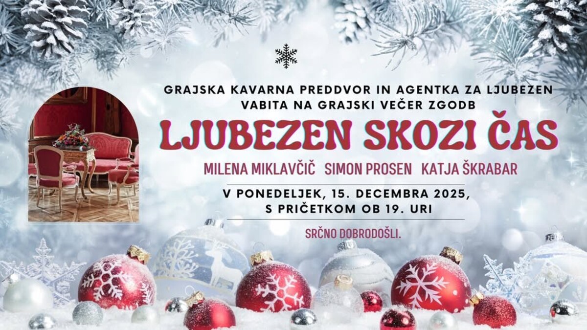 Gostje bodo obiskovalce popeljali na popotovanje skozi tri poglavja ljubezni – nekoč, danes in jutri. Pisateljica Milena Miklavčič bo govorila o ljubezni, dvorjenju in skrivnostih preteklih časov, povestičar Simon Prosen pa o ljubezni Slovencev skozi zgodovino. Za pogled v prihodnost bo poskrbela Katja Škrabar, agentka za ljubezen, ki bo osvetlila upanje, povezovanje in nove začetke v ljubezni danes in jutri. Pridružite se nam v čarobnem ambientu Grajske kavarne Preddvor, kjer bomo praznični čas obogatili z zgodbami in prijetnim druženjem.