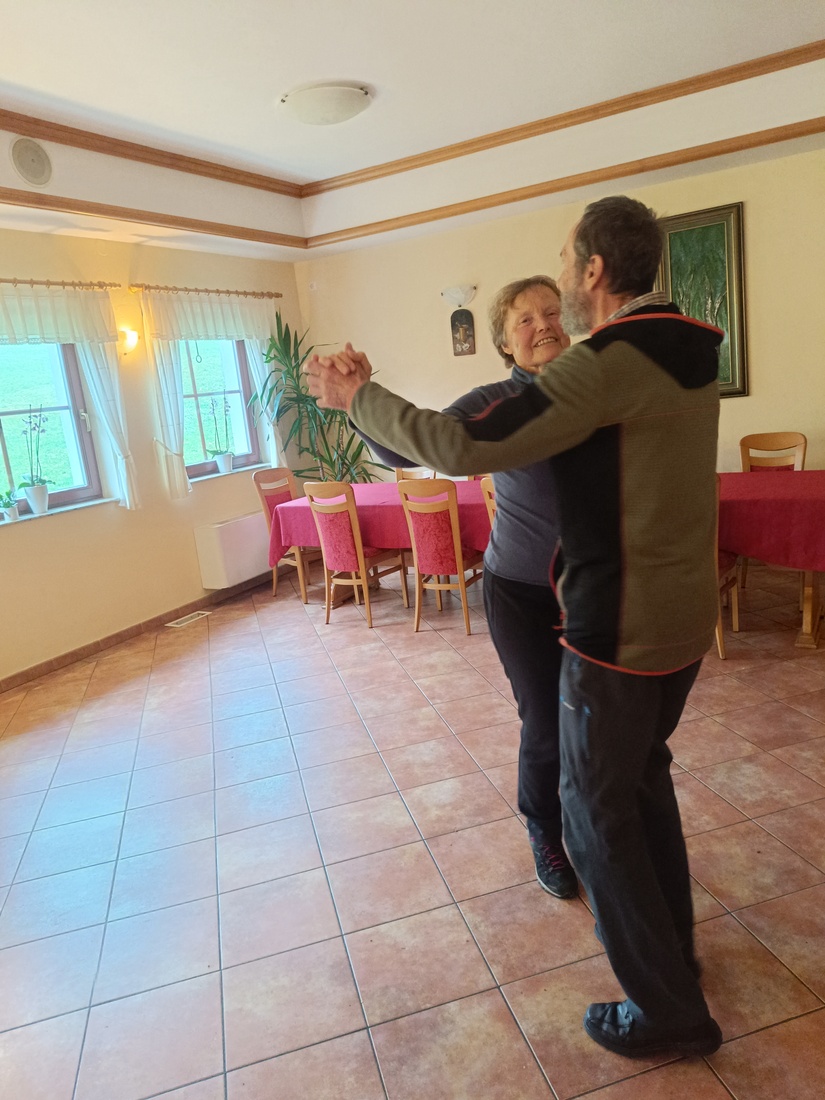 Zelo rada tudi pleše in poje. »Plesala sva z Janezom že kot mladoporočenca pri folklori, sama že preje s sosedovim Mirom v hotelu Bor za turiste. Enkrat so naju izbrali celo za najlepši par in dobila sva lesene belgijske cokle. Turisti so hodili tudi k nam in sem jih jaz vodila k cerkvi na Mačami ob torkih, ob sredah na Breg. Mlade fante pa je Janez krstil za sprejem v moško družbo,« še doda. Na plesne vaje sta začela hoditi s sodelavci OŠ Preddvor in še sedaj hodita v plesno šolo Čačača. »To je pa za dušo,« doda. Vmes najdeta čas za petje pri cerkvenem pevskem zboru sv. Petra Preddvor. Pevske vaje imajo ob petkih ob osmih zvečer, v nedeljo ob osmih plesne.
