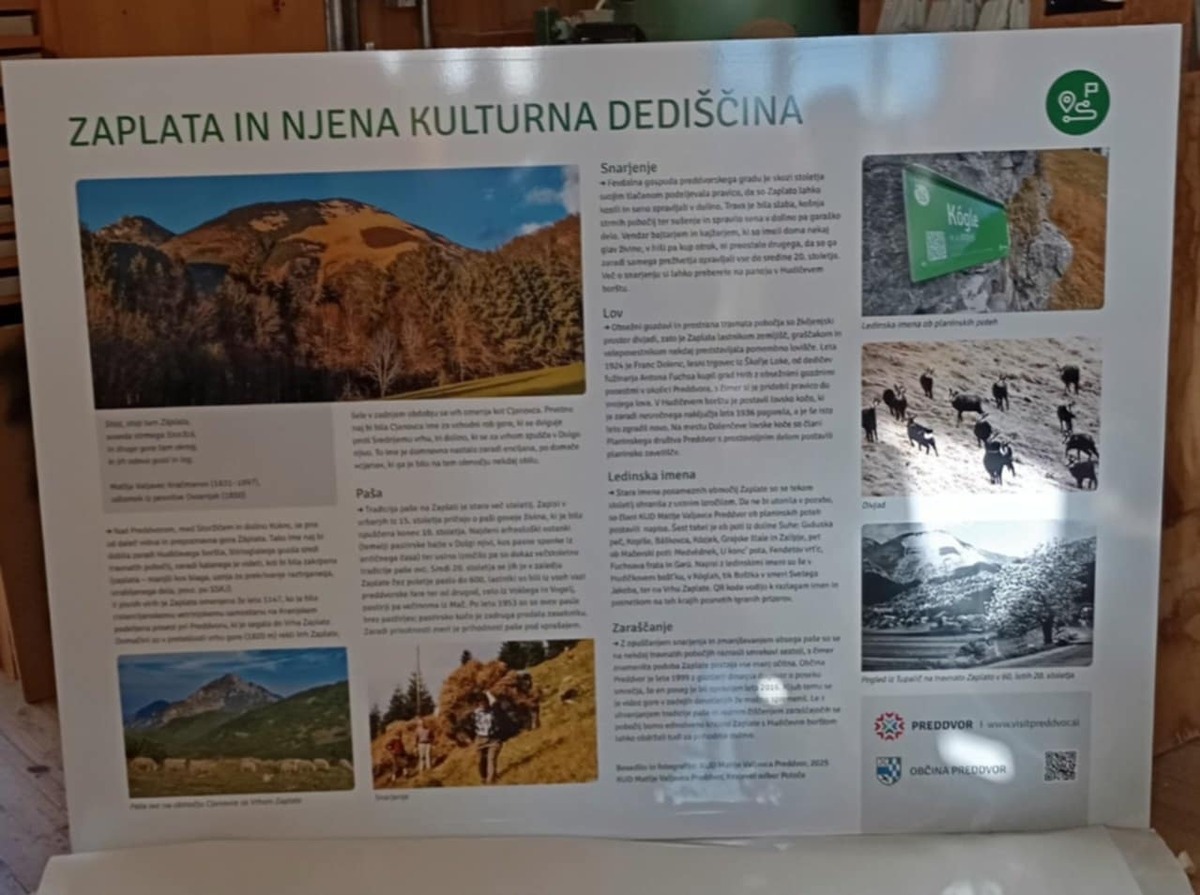 Posebej pestri in dejavni pa so bili zadnji meseci leta. Oktobra smo posneli recital ljubezenskih pesmi in ga decembra objavili v okviru dogodkov Mednarodnega festivala Brati gore 2025 ob svetovnem dnevu gora. Zbrali in pripravili smo gradivo za predstavitveni pano o Zaplati in njeni kulturni dediščini, ki bo odslej na izhodišču planinskih poti v Mačah osveščal obiskovalce gora - tudi po zaslugi našega dobrega sodelovanja z Zavodom za turizem in Krajevnim odborom Potoče.