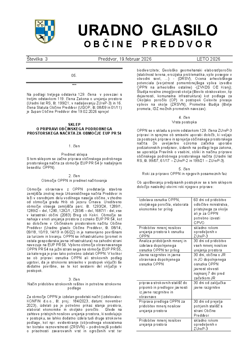 Sklep o pripravi OPPN za območje EUP PR 54 (Uradno glasilo Občine Preddvor - številka 03/2026)