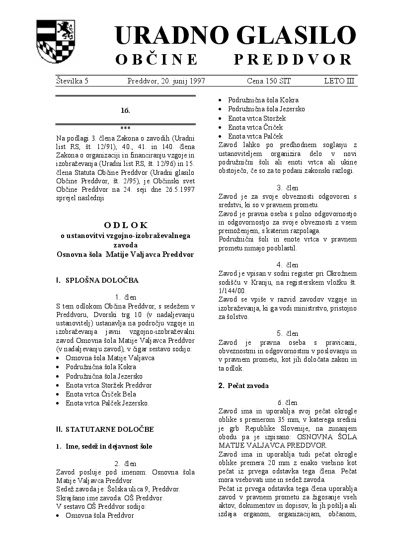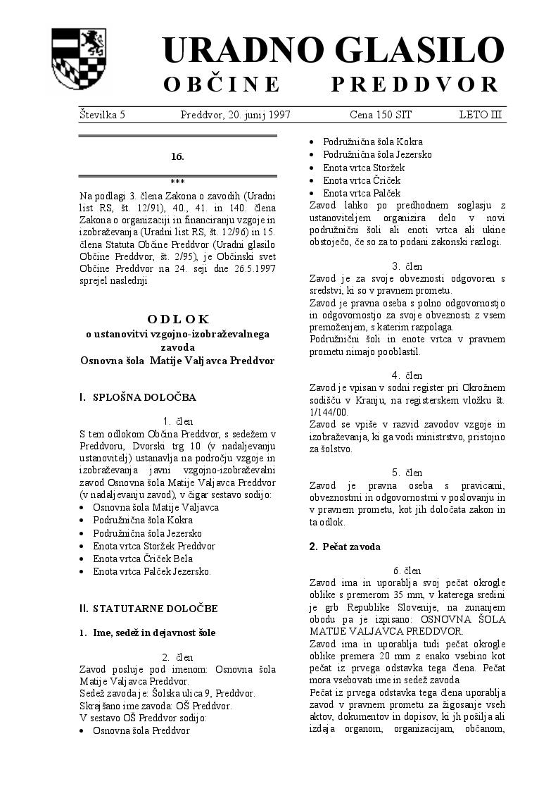Odlok o ustanovitvi vzgojno-izobraževalnega zavoda Osnovna šola Matije Valjavca Preddvor (Uradno glasilo Občine Preddvor – Številka 5/1997)