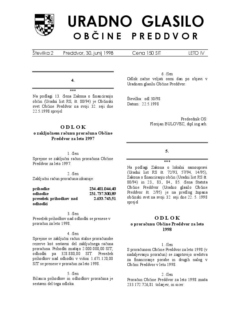 Odlok o proračunu Občine Preddvor za leto 1998 (Uradno glasilo Občine Preddvor – Številka 2/1998)