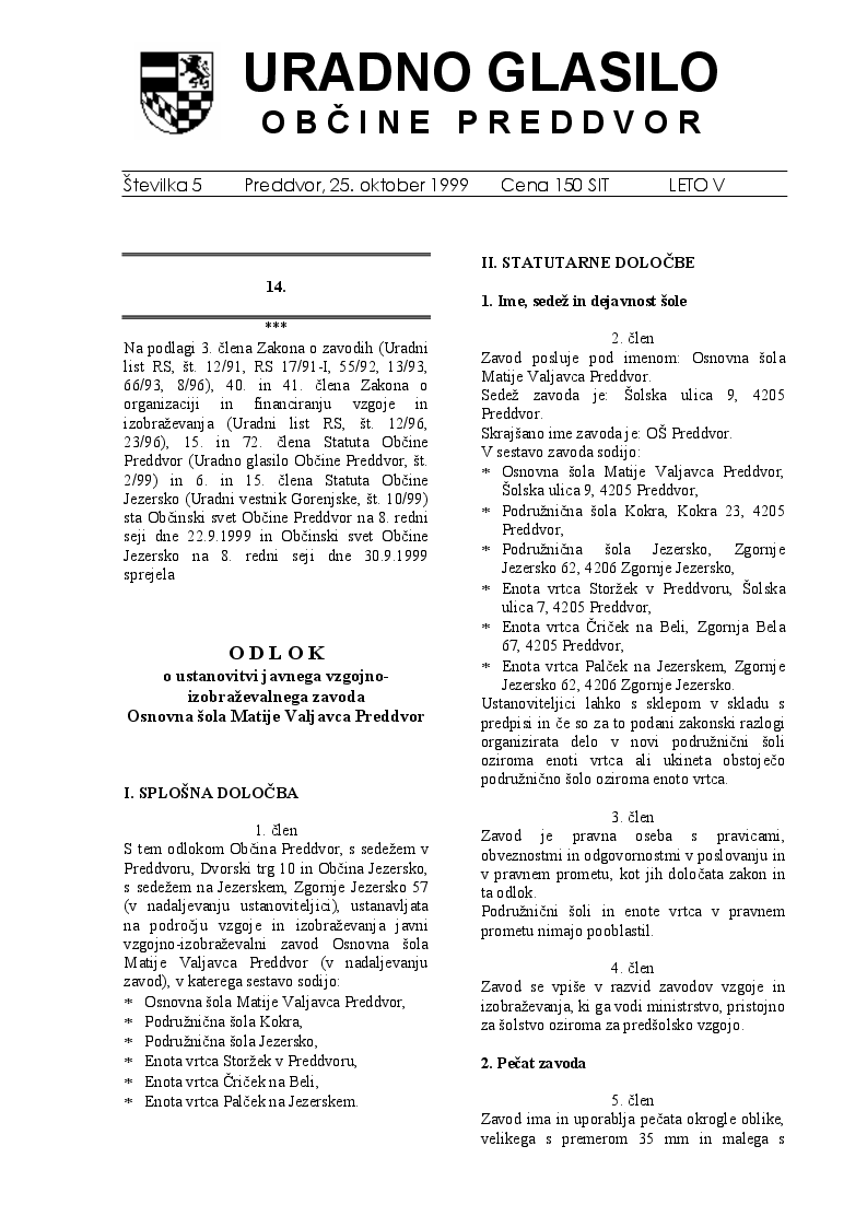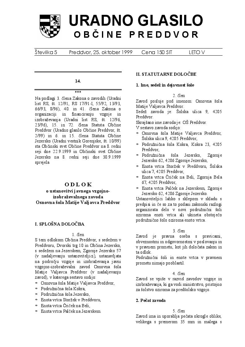 Odlok o ustanovitvi javnega vzgojno izobraževalnega zavoda Osnovna šola Matije Valjavca Preddvor (Uradno glasilo Občine Preddvor – Številka 5/1999)