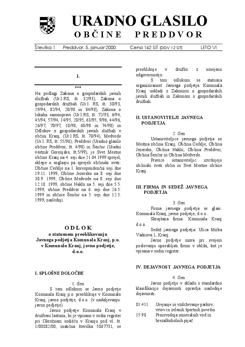 Odlok o statusnem preoblikovanju Javnega podjetja Komunala Kranj, p.o. v Komunalo Kranj, javno podjetje, d.o.o. (Uradno glasilo Občine Preddvor – Številka 1/2000)