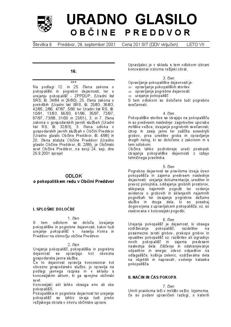 Odlok o pokopališkem redu v Občini Preddvor (Uradno glasilo Občine Preddvor – Številka 9/2001)