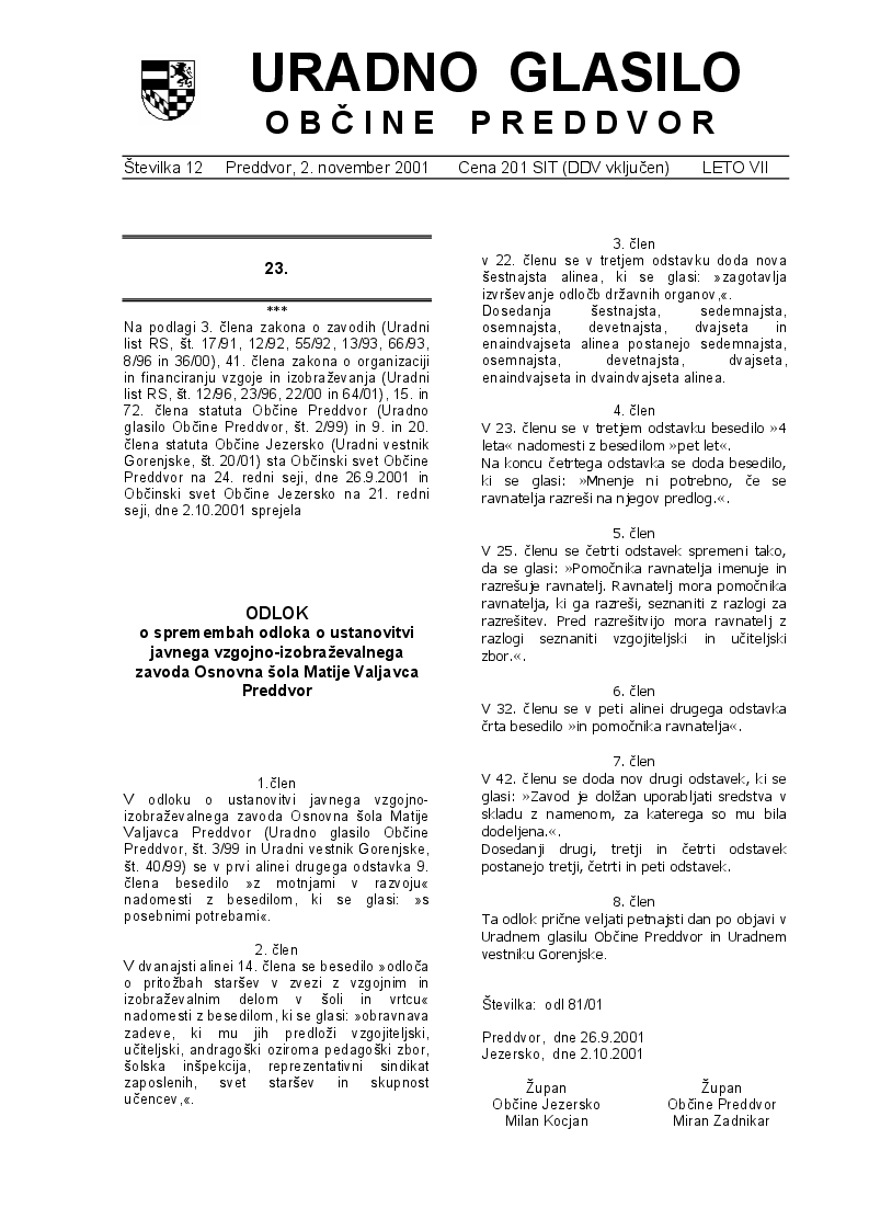 Odlok o spremembah Odloka o ustanovitvi vzgojno izobraževalnega zavoda Osnovna šola Matije Valjavca Preddvor (Uradno glasilo Občine Preddvor – Številka 12/2001)