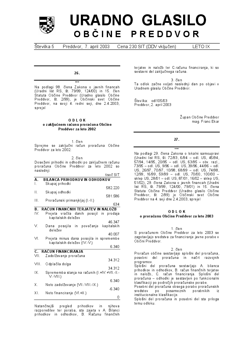 Odlok o zaključnem računu proračuna Občine Preddvor za leto 2002 (Uradno glasilo Občine Preddvor – Številka 5/2003)