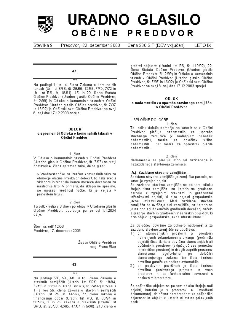 Odlok o nadomestilu za uporabo stavbnega zemljišča v Občini Preddvor (Uradno glasilo Občine Preddvor – Številka 9/2003)