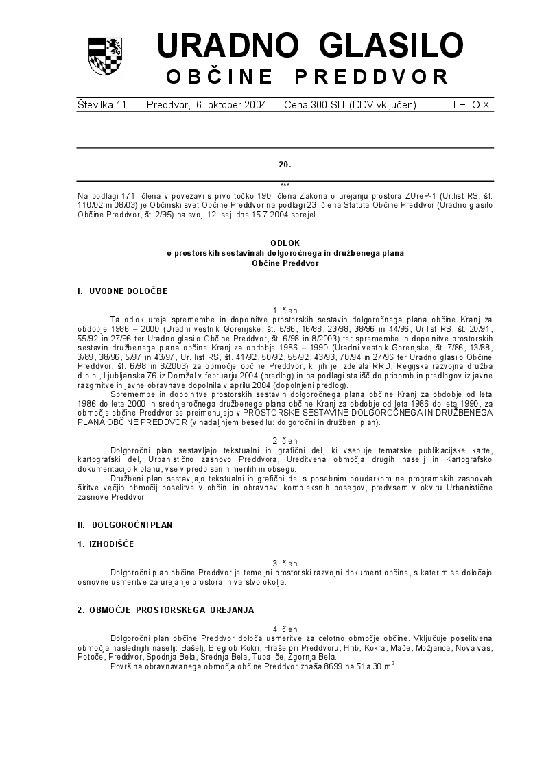 Odlok o prostorskih sestavinah dolgoročnega in družbenega plana Občine Preddvor (Uradno glasilo Občine Preddvor – Številka 11/2004)