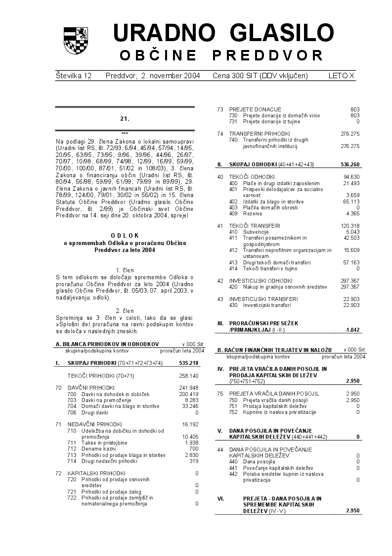 Odlok o spremembah Odloka o proračunu Občine Preddvor za leto 2004 (Uradno glasilo Občine Preddvor – Številka 12/2004)