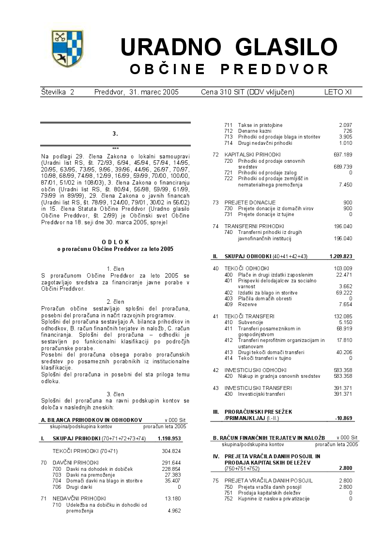Odlok o proračunu Občine Preddvor za leto 2005 (Uradno glasilo Občine Preddvor – Številka 2/2005)
