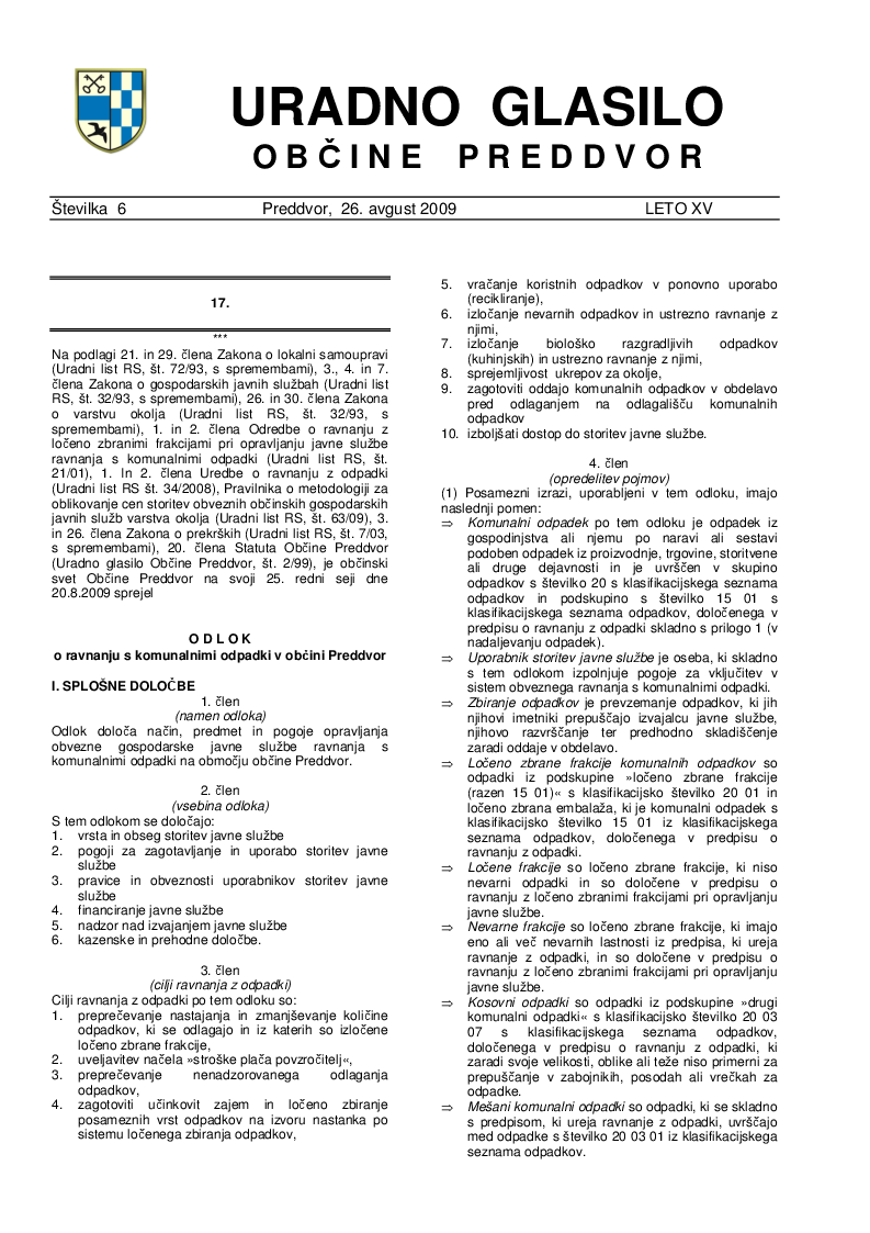 Odlok o ravnanju s komunalnimi odpadki v Občini Preddvor (Uradno glasilo Občine Preddvor – Številka 6/2009)