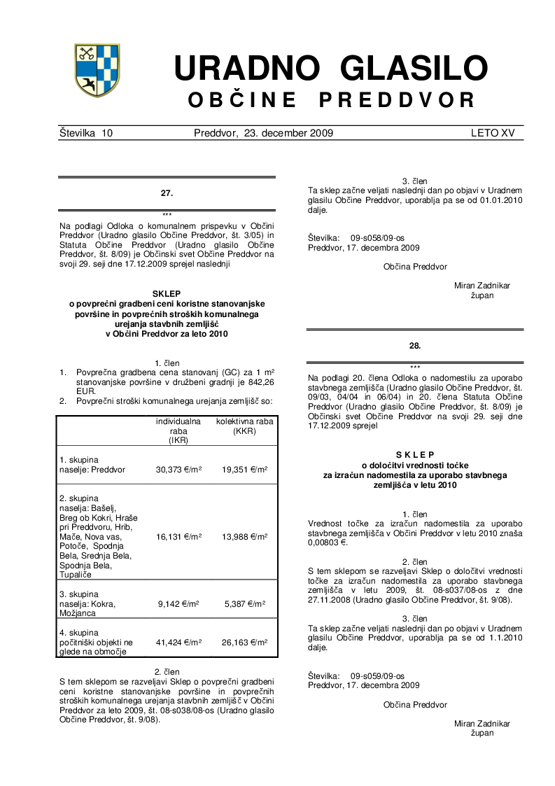 Sklep o povprečni gradbeni ceni koristne stanovanjske površine in povprečnih stroških komunalnega urejanja stavbnih zemljišč v Občini Preddvor za leto 2010 (Uradno glasilo Občine Preddvor – Številka 10/2009)