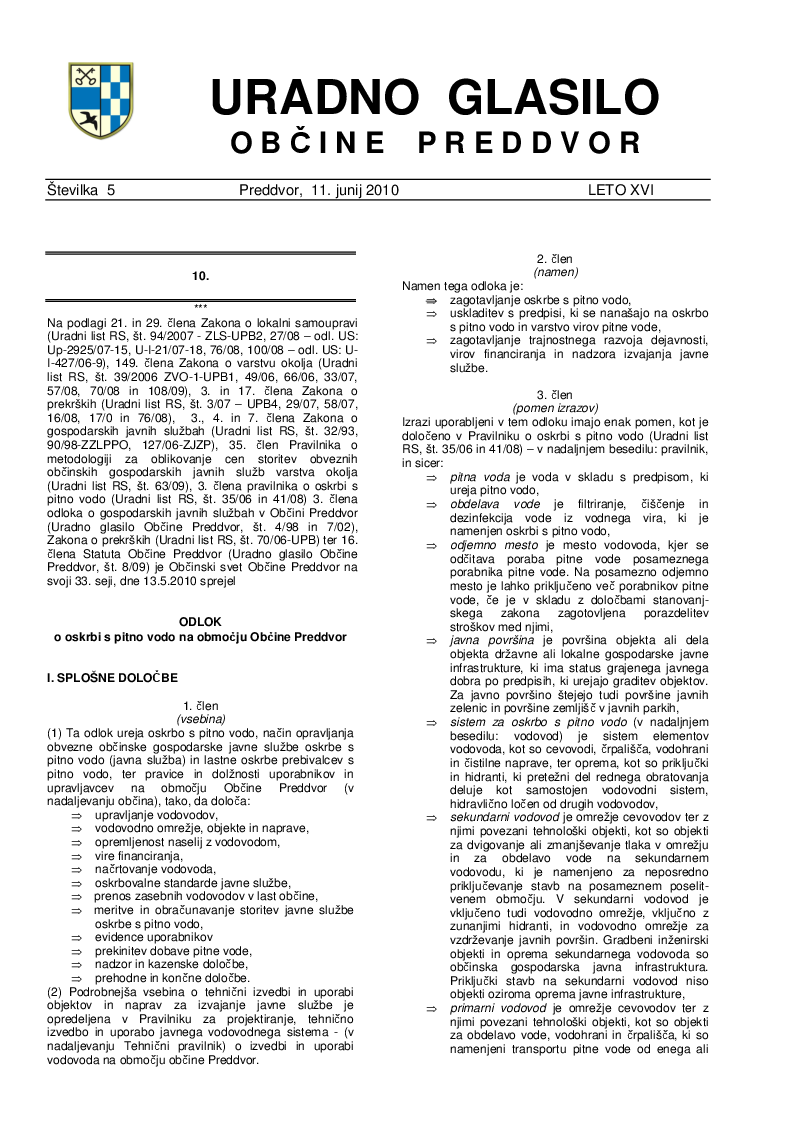 Odlok o oskrbi s pitno vodo na območju Občine Preddvor (Uradno glasilo Občine Preddvor – Številka 5/2010)
