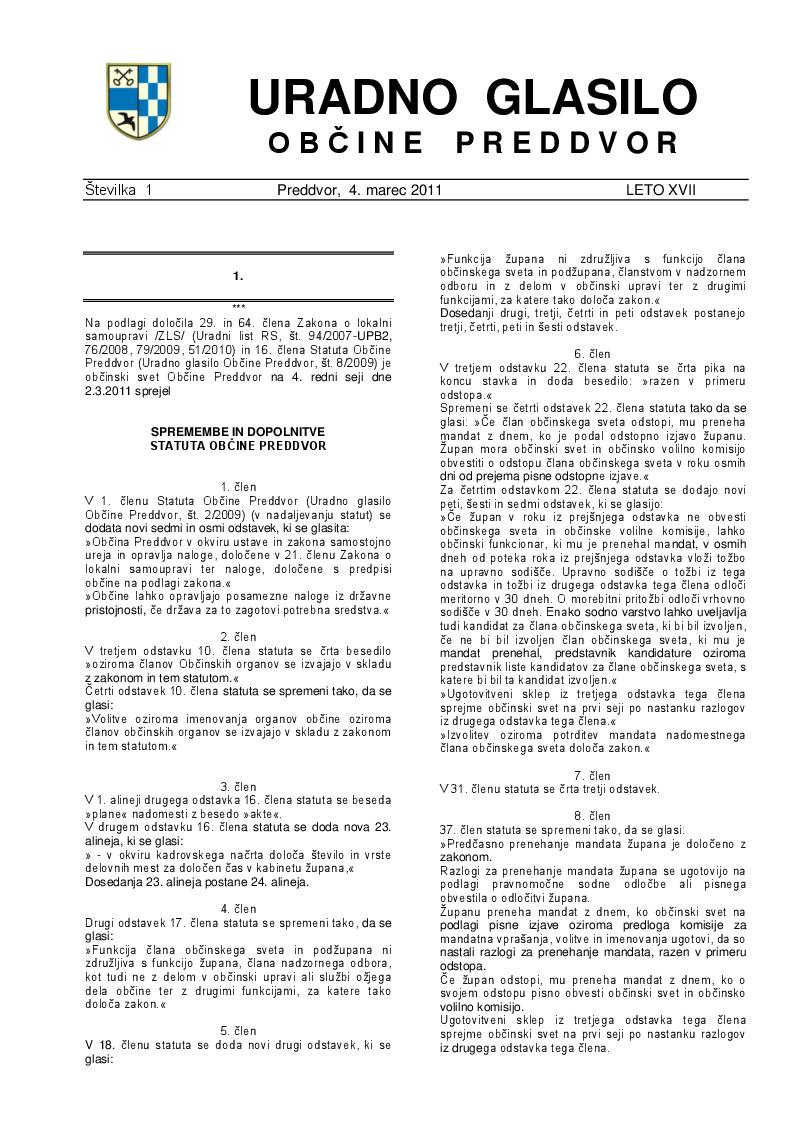 Spremembe in dopolnitve Statuta Občine Preddvor (Uradno glasilo Občine Preddvor – Številka 1/2011)