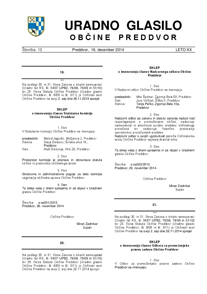 Sklep o imenovanju članov Odbora za premoženjsko pravne zadeve Občine Preddvor (Uradno glasilo Občine Preddvor – Številka 10/2014)