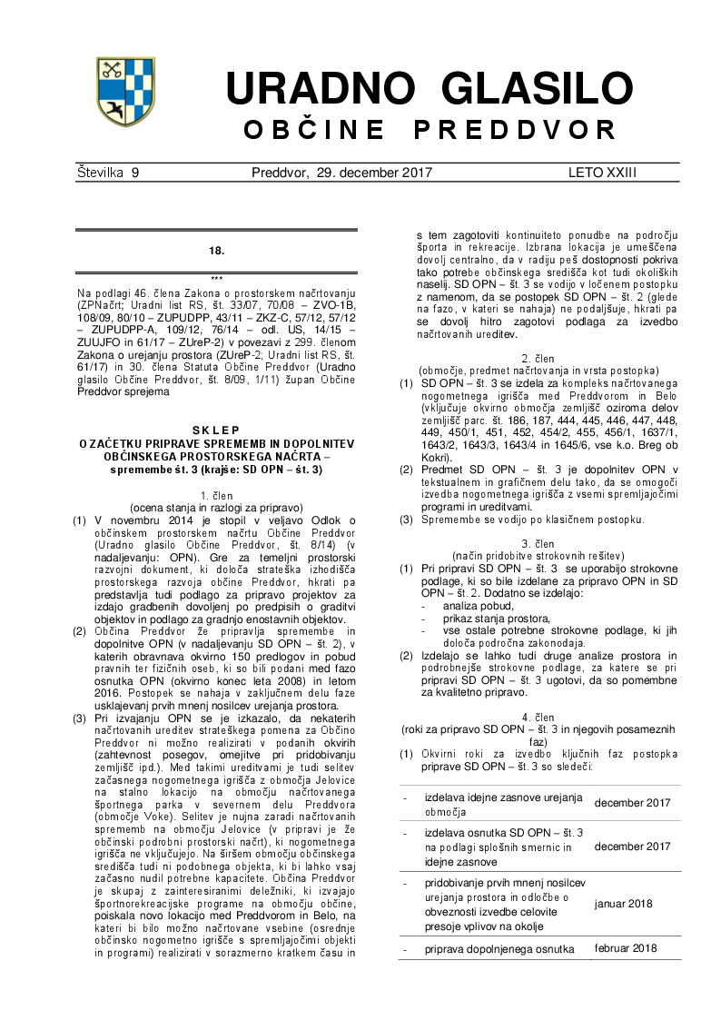 Sklep o začetku priprave sprememb in dopolnitev Občinskega prostorskega načrta – spremembe št. 3 (krajše: SD OPN–št. 3) (Uradno glasilo Občine Preddvor – Številka 9/2017)