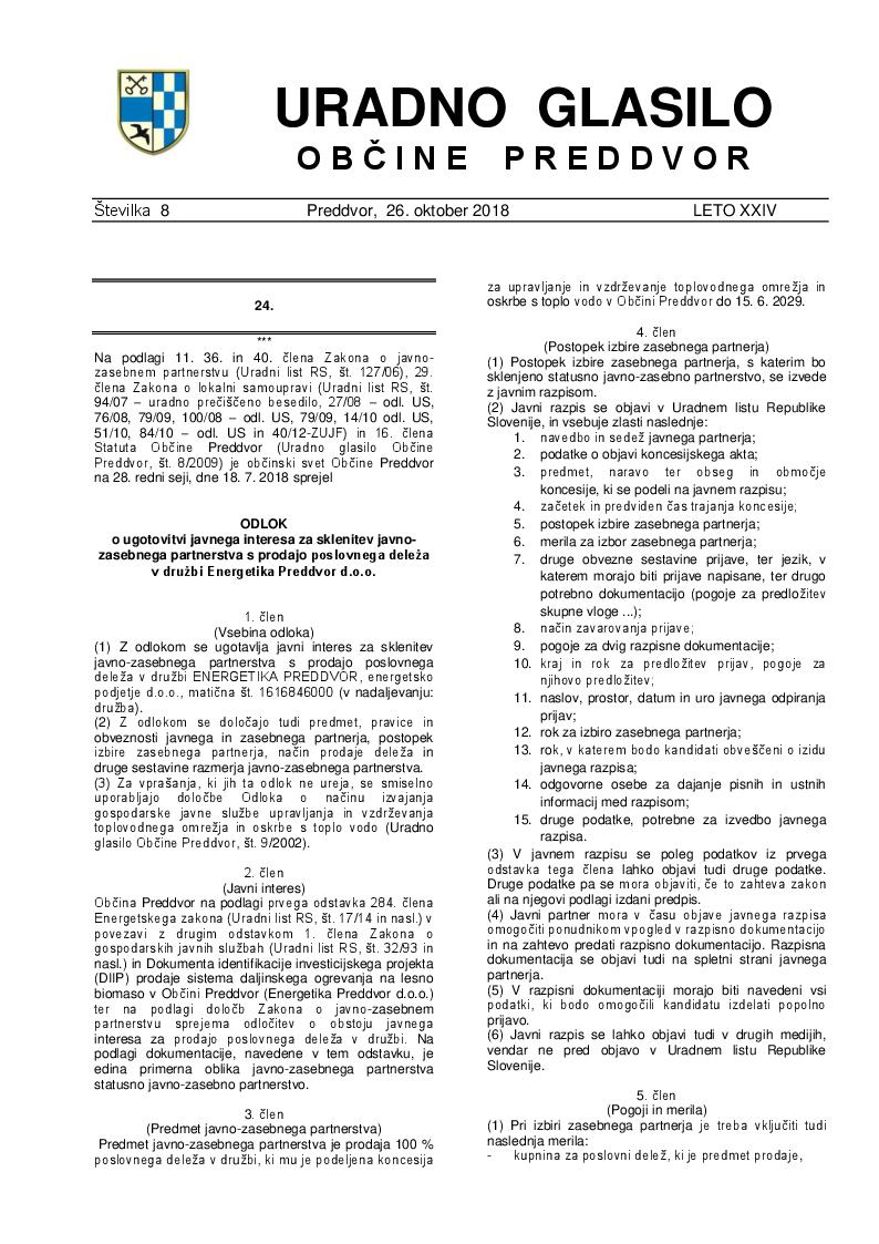 Odlok o ugotovitvi javnega interesa za sklenitev javno-zasebnega partnerstva s prodajo poslovnega deleža v družbi Energetika Preddvor d.o.o. (Uradno glasilo Občine Preddvor – Številka 8/2018)
