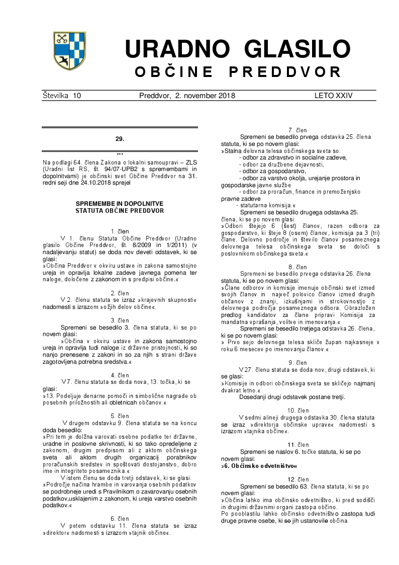 Spremembe in dopolnitve Statuta Občine Preddvor (Uradno glasilo Občine Preddvor – Številka 10/2018)