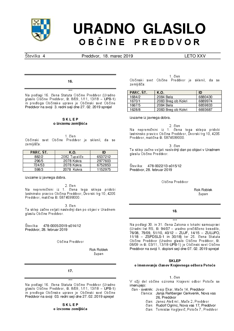 Sklep o imenovanju članov Krajevnega odbora Potoce (Uradno glasilo Občine Preddvor – Številka 4/2019)