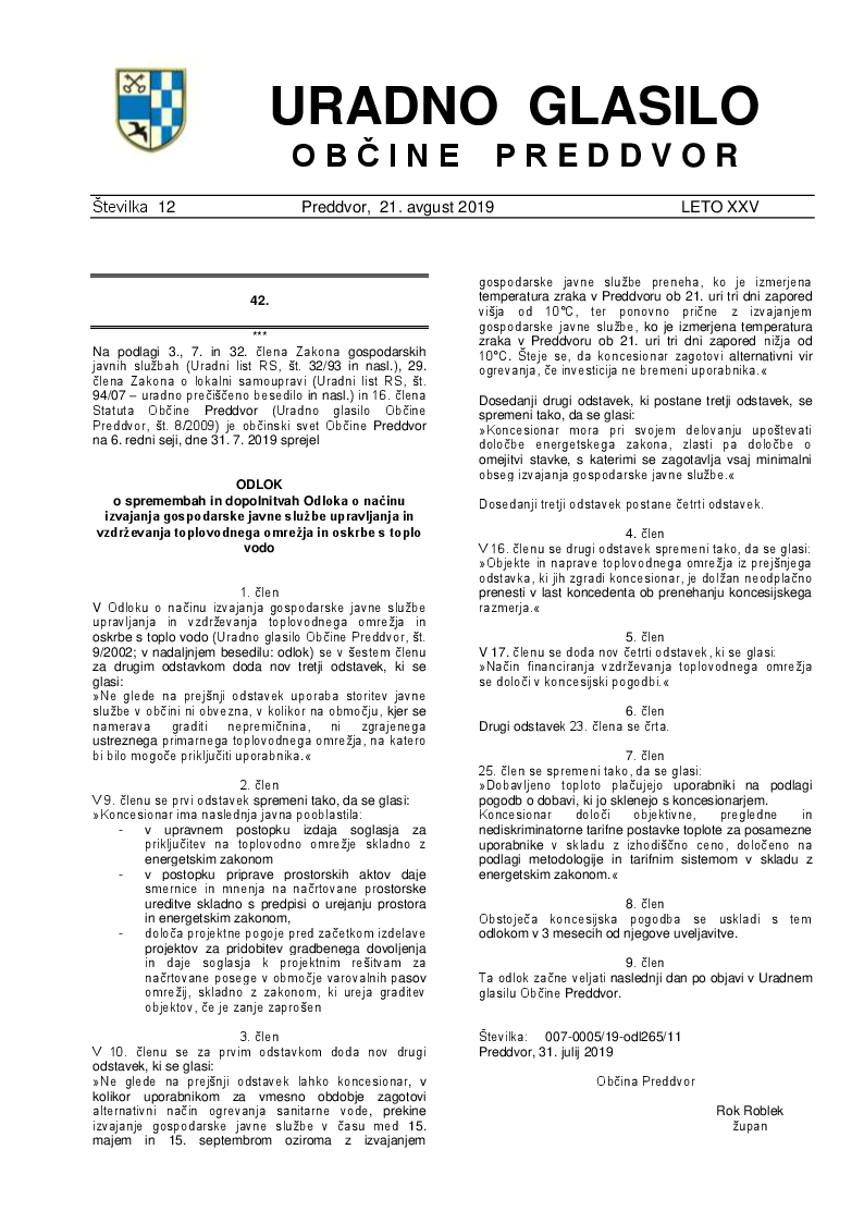 Odlok o spremembah in dopolnitvah Odloka o načinu izvajanja gospodarske javne službe upravljanja in vzdrževanja toplovodnega omrežja in oskrbe s toplo vodo (Uradno glasilo Občine Preddvor – Številka 12/2019)