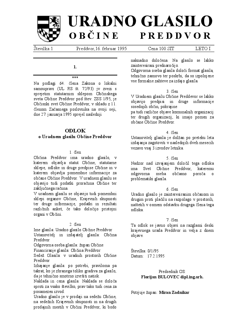 Uradno glasilo Občine Preddvor – Številka 1/1995
