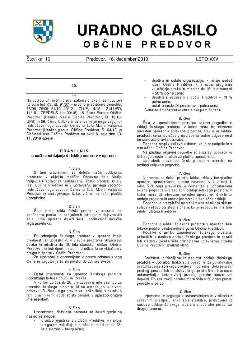 Sklep o določitvi uporabnine šolskih prostorov (Uradno glasilo Občine Preddvor - Številka 16/2019)