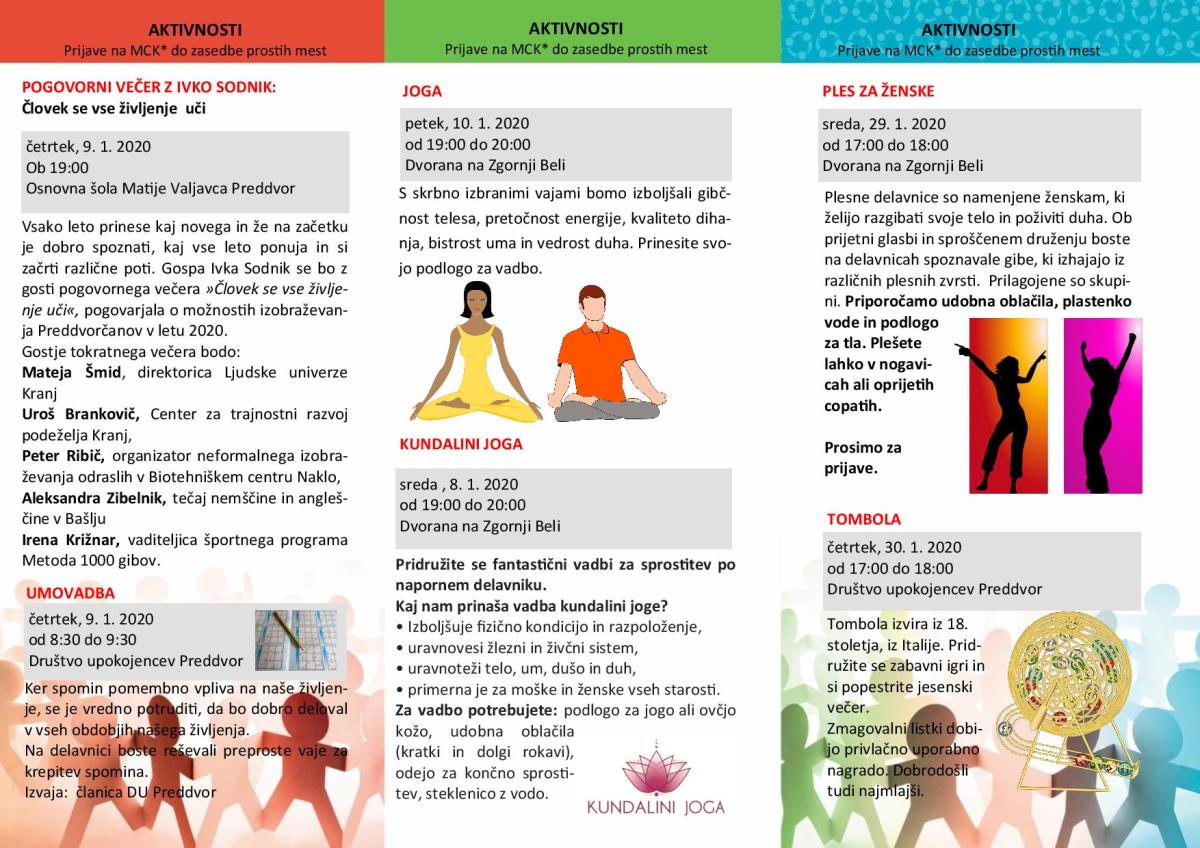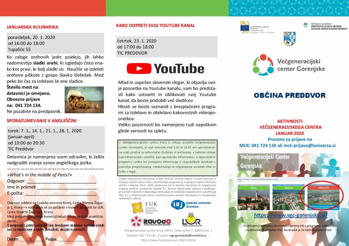 Večgeneracijski center Gorenjske je tudi za januar 2020 pripravil več brezplačnih aktivnosti v Preddvoru. Za zdravo telo in duha so na programu vadba joge, kundalini joge in umovadbe, pa tombola in ples za ženske. Naučili se bomo lahko kako odpreti svoj youtube kanal in vadili sporazumevanje v angleščini, na kulinarični delavnici pa izdelali orehove piškote. Vsako leto prinese kaj novega. Že na začetku je dobro spoznati, kaj vse ponuja ter si začrtati poti. Za lažjo odločitev in načrtovanje velja obiskati pogovorni večer »Človek se vse življenje uči«, na katerem se bo gospa Ivka Sodnik z gosti pogovarjala o možnostih izobraževanja Preddvorčanov v letu 2020. Podrobnosti si preberite v priloženem letaku ali v rubriki dogodki. Vse dejavnosti so brezplačne.