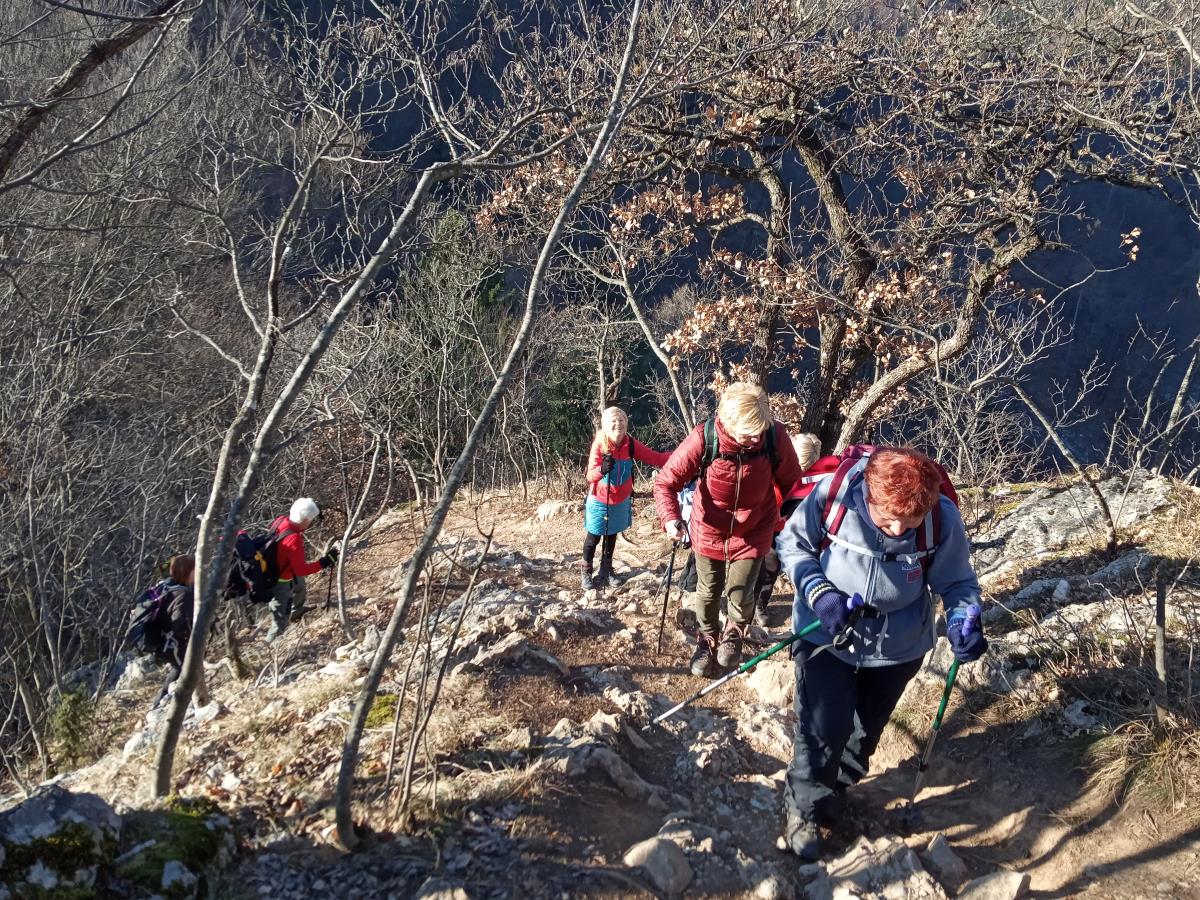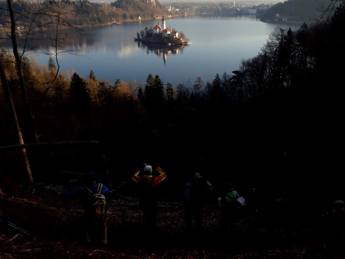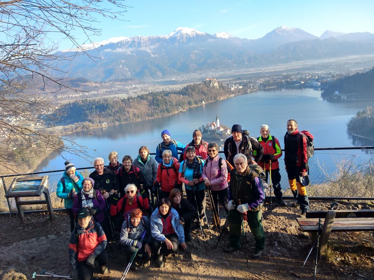V torek, 14.1.2020, smo se v sončnem mrzlem januarskem jutru s kombijem in tremi avtomobili odpeljali proti Bledu. Dvajset pohodnikov z našim vodnikom Janezom Planincem smo se vzpeli najprej na Malo Osojnico na 691 m, nato Veliko Osojnico na 756 m in vzpone končali na Ojstrici na 610 m. Parkirali smo ob nekdanjem Domu muzealcev Slovenije in se povzpeli v strmo dvigajoči hrib. Že kmalu po startu smo prehodili prvih deset stopnic in se vedno više dvigovali, dokler nismo prispeli do 90-ih stopnic, varovanih z jeklenico. Verjetno je bil to najatraktivnejši del poti s čudovitim pogledom nazaj na Blejsko jezero in okoliške zasnežene vršace. Naš prvi postanek in uživanje ob panorami pod nami je bil na Mali Osojnici. Kmalu smo se odpravili naprej do Velike Osojnice in še pred tem imeli pred seboj pogled na drugo stran hriba na Babji zob, Galetovec in začetek bohinjske kotline. Naš zadnji, tokrat spet strm skalnat vzpon, je bil na Ojstrico, kjer smo še zadnjič opazovali pod seboj Bled in Blejsko jezero ter karavanške vrhove vse naokoli in pomalicali. Vso pot smo hodili po suhem šumečem listju, vmes je bilo nekaj skritih korenin in kamenje. Sledil je spust nazaj v dolino k našim avtomobilom. Pohod smo zaključili s pogostitvijo dveh novih članic, s kavico Metke Štempihar in sladkimi dobrotami Drage Capuder, ki bosta odslej hodili z nami. Kratek pohod s tremi strmimi vzponi na vse tri vrhove, ki jih večinoma nismo prehodili, nas je navdušil s svojo lepoto in presegel vsa pričakovanja!!! Zapisala: mag. Franceska Žumer Fotografije: Janez Planinc