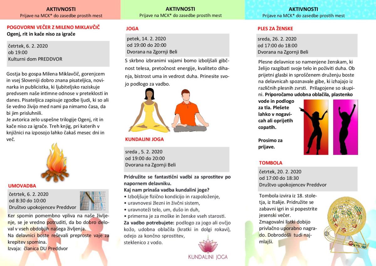 Večgeneracijski center Gorenjske je tudi ta mesec pripravil več dejavnosti v Preddvoru. Poleg rednih vadb joge, kundalini joge in umovadbe so tudi tokrat poskrbeli za sporazumevanje v angleščini, tombolo, ples za ženske ter kulinarično in šivalno delavnico, enkraten dogodek pa bo pogovorni večer s pisateljico Mileno Miklavčič. Podrobnosti najdete v priloženi zgibanki ter v koledarju dogodkov na spletni strani Občine Preddvor. Vljudno vabljeni, da se dogodkov udeležite, vstop je prost, zaželene pa so prijave na 04 280 48 25 ali mck-prijava@luniverza.si.