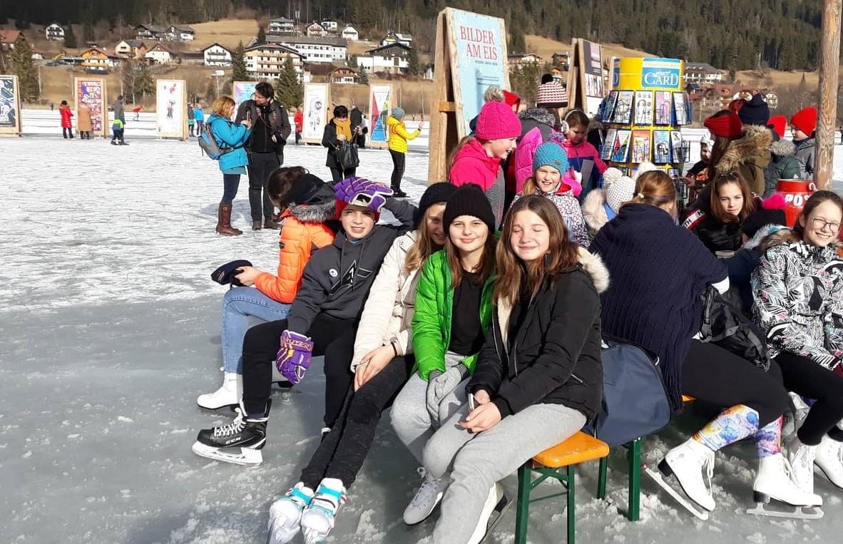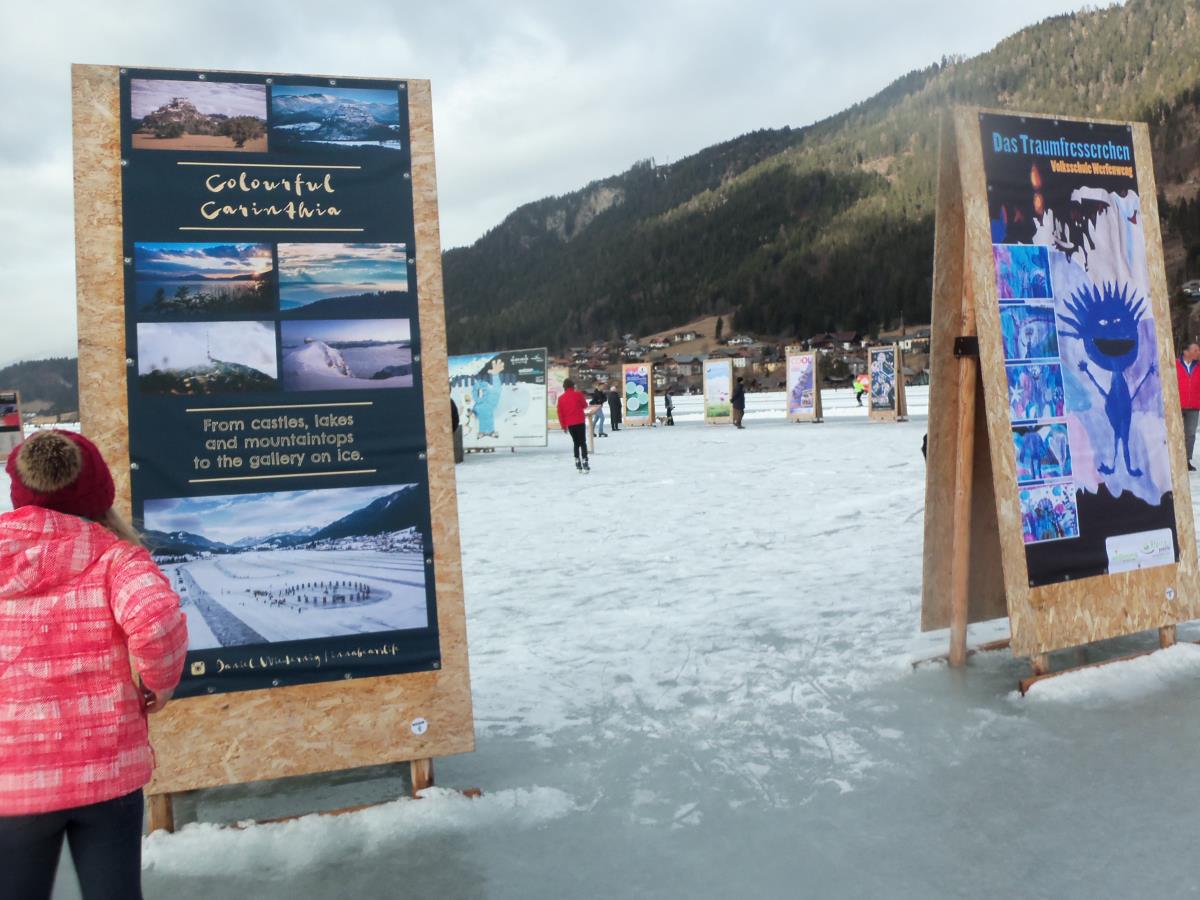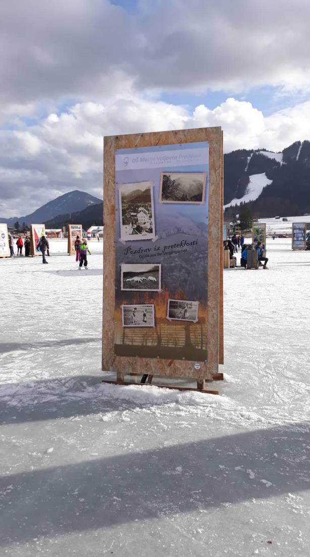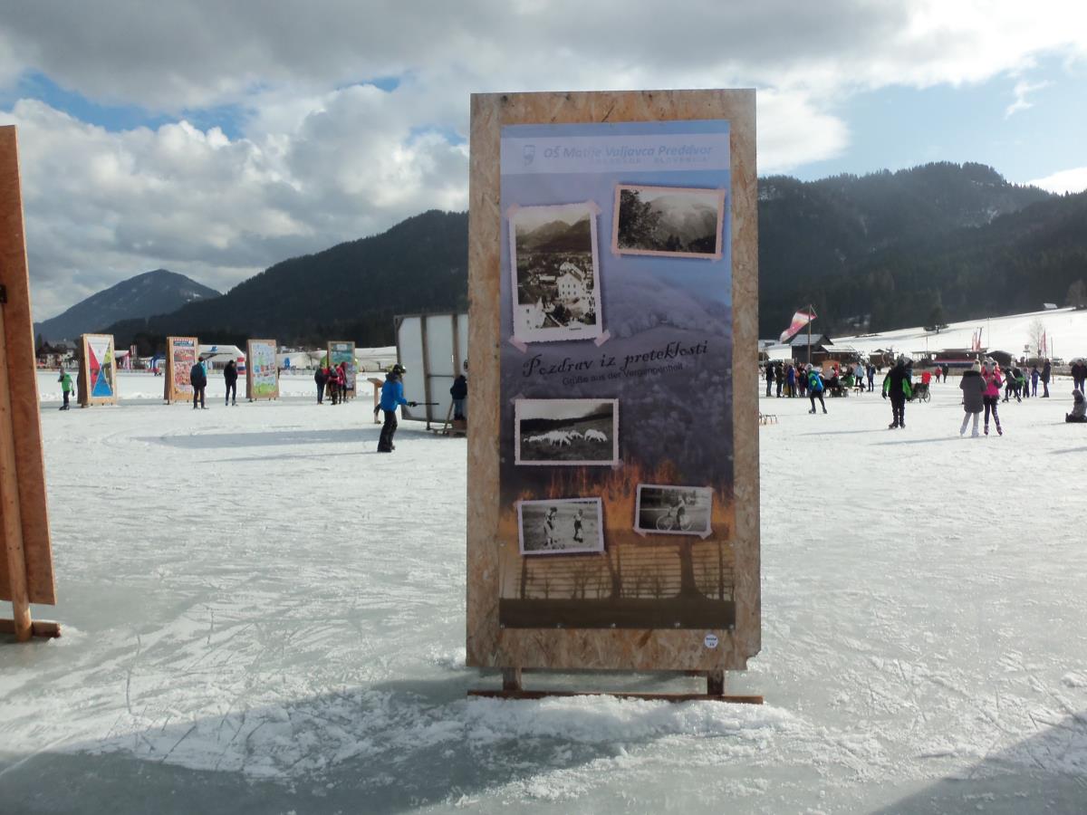 Osnovna šola Matije Valjavca Preddvor tudi letos sodeluje na mednarodni razstavi Slike na ledu - Bilder am Eis na jezeru Weissensee v Avstriji, ki jo že od leta 2003 prireja Land Kärnten Medienzentrum. Tokrat smo se odločili, da pokažemo nekaj na fotografijah ujetih trenutkov preddvorske preteklosti, ob čemer se je kar sam ponudil slogan za zastavo in razglednice »Pozdrav iz preteklosti«. Zaplata, kakršna je bila pred več kot 50 leti, paša na njej, središče vasi s potokom Suha, pa jezero, ob katerem še ni hotela, ročno sušenje sena in kozolec, v ozadju starih slik pa sedanjost. Naša zastava tako turistom prikazuje lepote našega domačega kraja, zbuja zanimanje in morda celo koga privabi na obisk v Preddvor. Krog raznolikih zastav na jezeru s slovenskim imenom Belo jezero so si na dan odprtja razstave, 26. januarja ogledali tudi udeleženci ekskurzije iz naše šole. Čeprav je bilo vreme nekoliko južno in zato led malce mehak, so preživeli lep drsalni dan. Razstavo si bo moč ogledati dokler bo jezero zamrznjeno, nato pa bo naša najnovejša zastava – tako kot že vse njene predhodnice – krasila prostore šole, razglednico z enakim motivom pa boste kmalu lahko dobili v TICu Preddvor. Koordinatorici projekta Petra Lombar Premru in Katarina Klakočar Teršek Idejna zasnova letošnje preddvorske slike na ledu: Milena Tavželj Fotografije: Katarina Klakočar Teršek, Mira Vizjak, Martin Premru