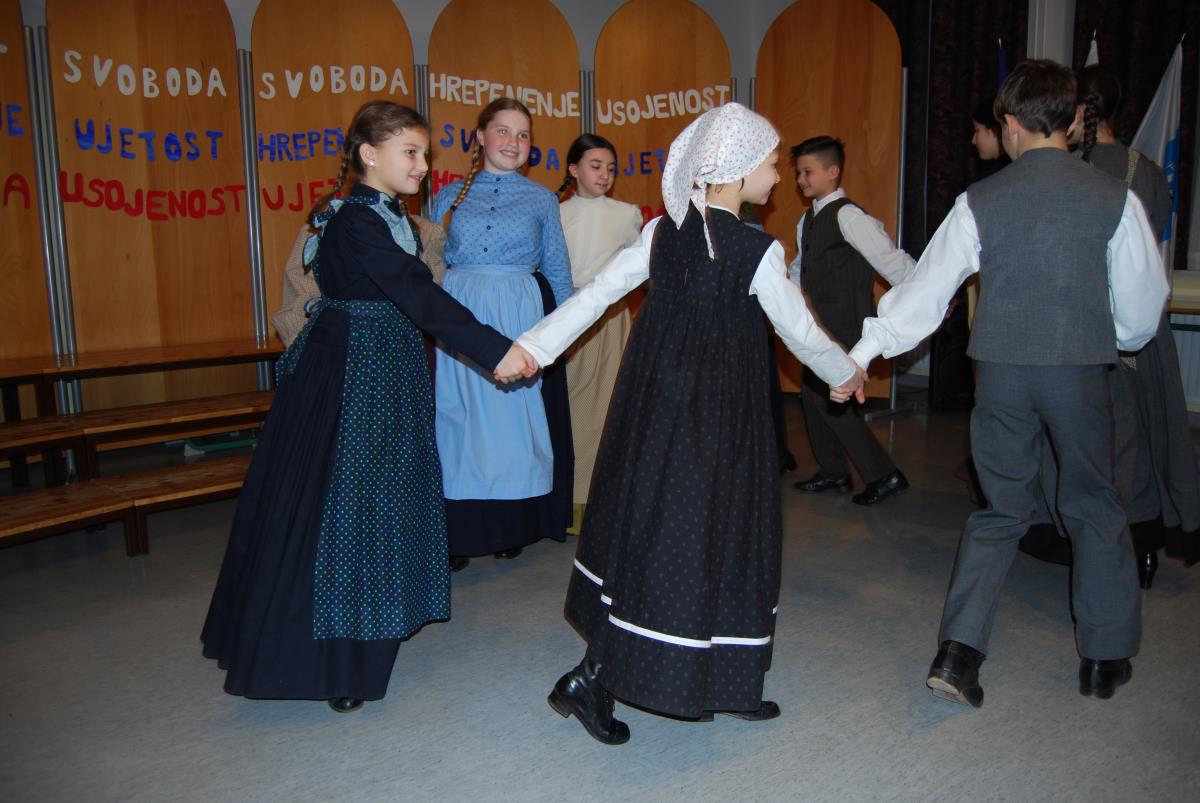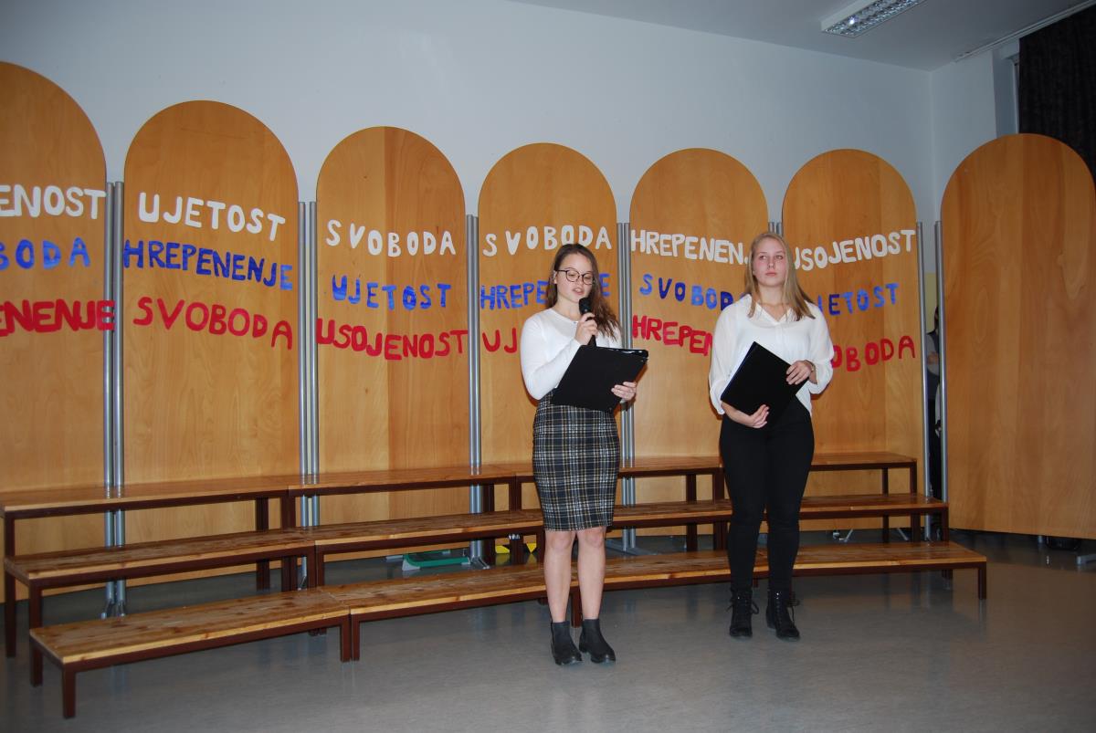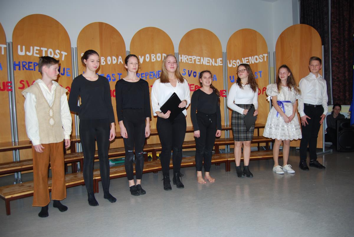 Bogat in raznovrsten kulturni program so izvedli učenke in učenci višjih razredov. Uprizorili so Prešernovo Lepo Vido in recital ljubezenskih ljudskih pesmi Ljubezen in usoda, z Zdravljico ter ljudskima pesmima Pastirče mlado in Teče mi vodica je nastopila pevska skupina, nadarjeni glasbeniki so navdušili z igranjem na evfonij, prečno flavto in klavir, dekleti sta zapeli ob kitarah, za domače vzdušje pa je s spletom ljudskih plesov poskrbela otroška skupina preddvorskega folklornega društva. Povsem drugačen in presenetljiv pa je bil zaključek prireditve: sodobna instalacija z igro in plesom Ujetost. »Morali bomo utišati zvočnike po cestah in domovih, utrniti mnogo sveč po oltarjih in prižigati novih luči, da osvetlijo človeka, njegovih poti. Morali bomo! Zakopati mnogo preglasnih besed in spregovoriti novih, dobrih, tišjih, resničnih,« so vzklikali dekle, fant in črne sence ter marsikateremu obiskovalcu ponudil misel za popotnico in razglabljanje o kulturi.