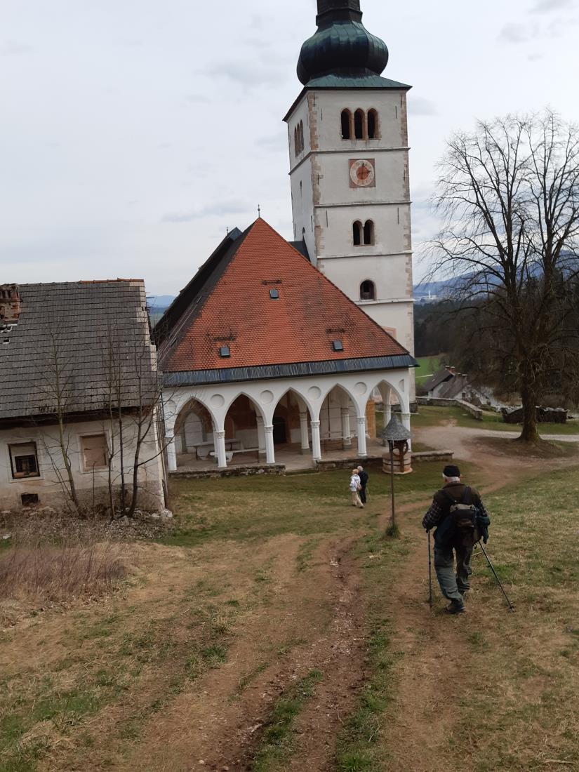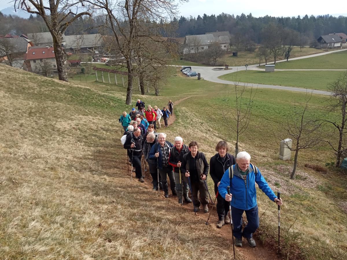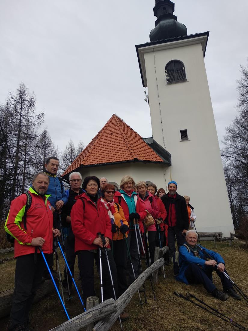 Kot običajno smo se tokrat zelo številčno, 29 pohodnikov, ob osmih z osebnimi avtomobili odpeljali do Crngroba. Prvi postanek je bil pred cerkvijo, kjer so snemali tudi film Cvetje v jeseni. Je pa Crngrob znamenita cerkev Marijinega oznanjenja. Začetki cerkve segajo v 13. stoletje, a so jo zaradi potreb romarjev dozidavali in je današnjo podobo dobila v 19. stoletju. Pot smo nadaljevali po označeni planinski in Jakobovi poti proti Planici. Na razpotju ob spomeniku NOB smo lahko podoživljali neprijetno preteklost in krutost vojne. Zavili smo levo proti vasi Lavtarski vrh in se mimo nje povzpeli na 824 m visok vrh Planica s cerkvijo sv. nadangela Gabrijela. Tukaj smo danes že drugič na cerkveni spominski plošči prebrali o človeški brezglavosti o požigu cerkve med vojno. Ponovno so jo zgradili in blagoslovili ob 50-letnici konca druge svetovne vojne leta 1995 v spomin vsem vojnim in povojnim žrtvam. Naj nam oba spomenika neljube preteklosti ostaneta kot opomnik človeški zverinskosti. Nas je pa očarala okolica, saj se nam je odprl čudovit pogled na Polhograjsko in Škofjeloško hribovje, Gorenjsko ter Kamniške Savinjske Alpe. Uživali smo v pomladnem dehtenju, se okrepčali s Tinetovim zdravilom in Draginimi vedno odličnimi sladkarijami. Sledilo je še slikanje in nato smo pot nadaljevali proti Križni gori, kjer smo na razcepu zavili nazaj proti Planici.
