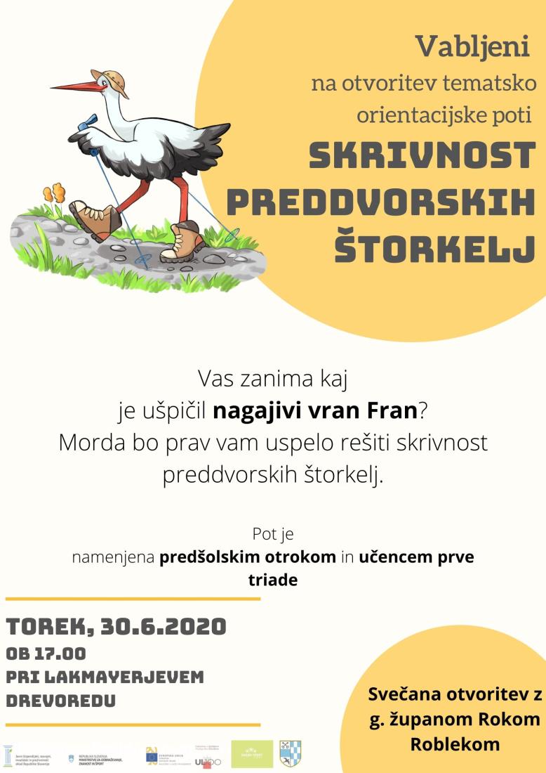 Vabljeni na otvoritev tematsko orientacijske poti Skrivnost preddvorskih štorkelj, ki bo v torek, 30. junija 2020, ob 17h v grajskem parku v Preddvoru. Pot je namenjena predšolskim otrokom in šolarjem prve triade.