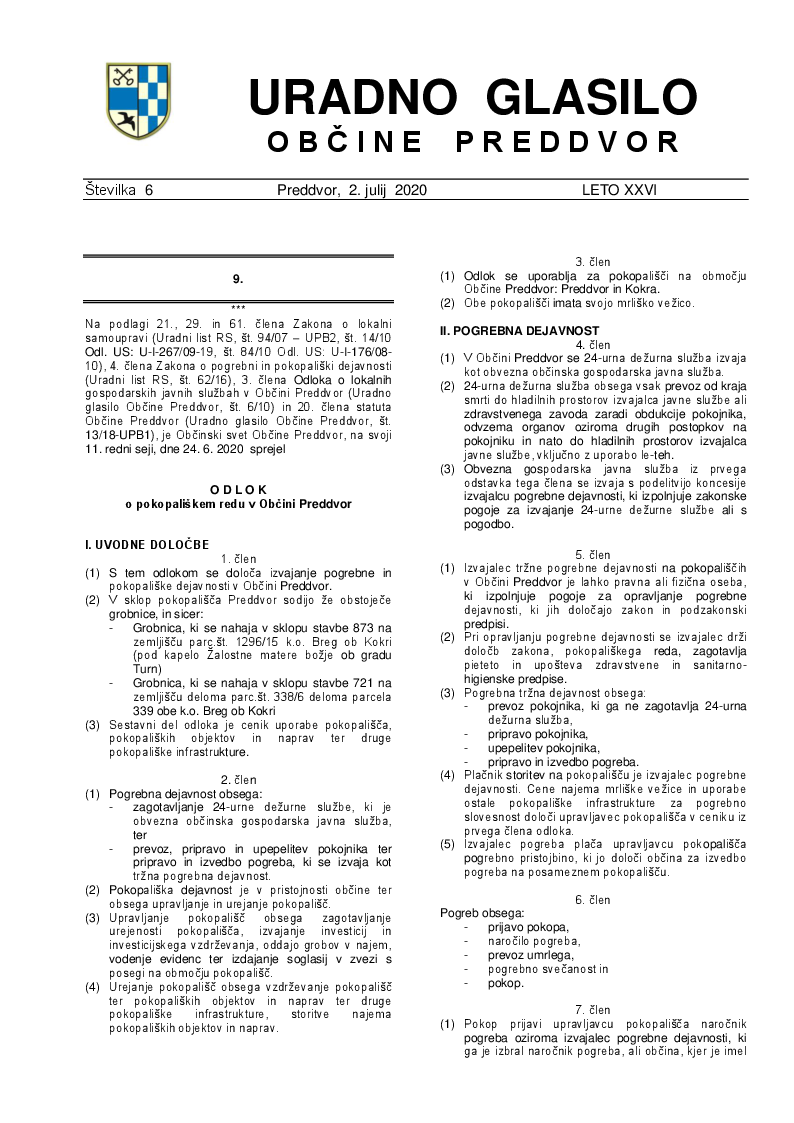 Odlok o pokopališkem redu v Občini Preddvor (Uradno glasilo Občine Preddvor - Številka 6/2020)