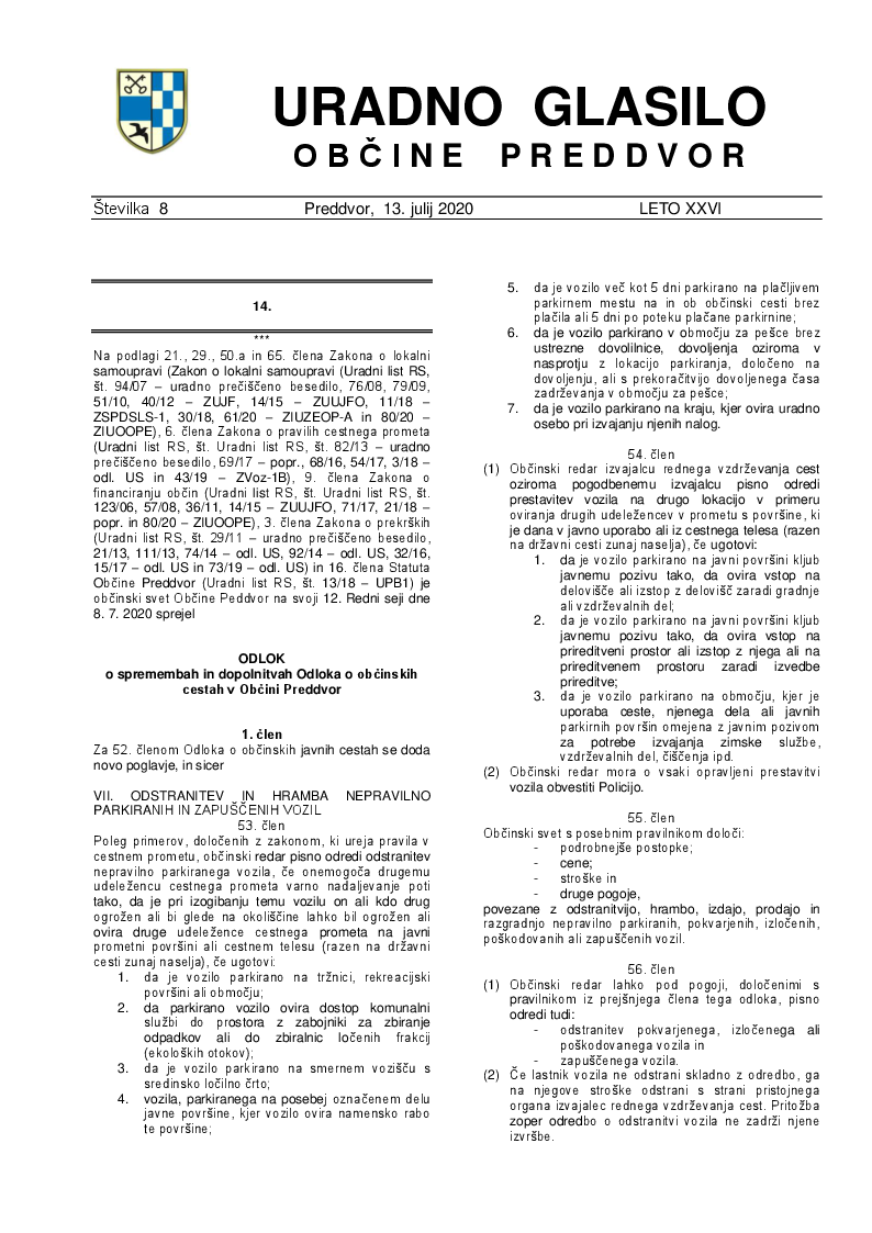 Odlok o spremembah in dopolnitvah Odloka o občinskih cestah v Občini Preddvor (Uradno glasilo Občine Preddvor - Številka 8/2020)