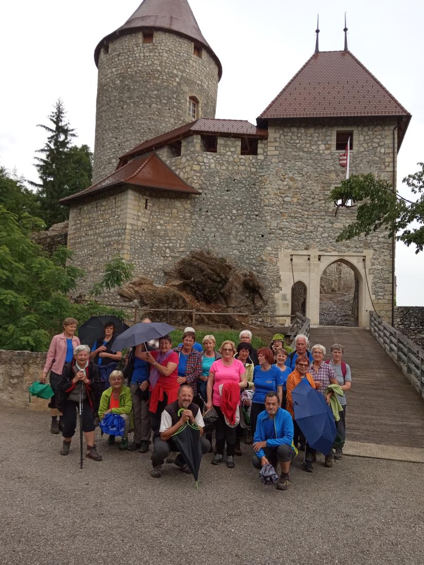 Ob novem naselju pri reki, kjer je včasih stal zelo znan Fikov mlin, smo občudovali velik star mlinski kamen. Pot smo nadaljevali po klancu na »visoko». Namesto pohodnih palic smo pred vhod gostilne Pri Kovaču, kjer smo se ustavili na kavici in praznovali rojstni dan udeleženke in rojstvo novega Janezovega vnuka, postavili naše velike mokre dežnike.