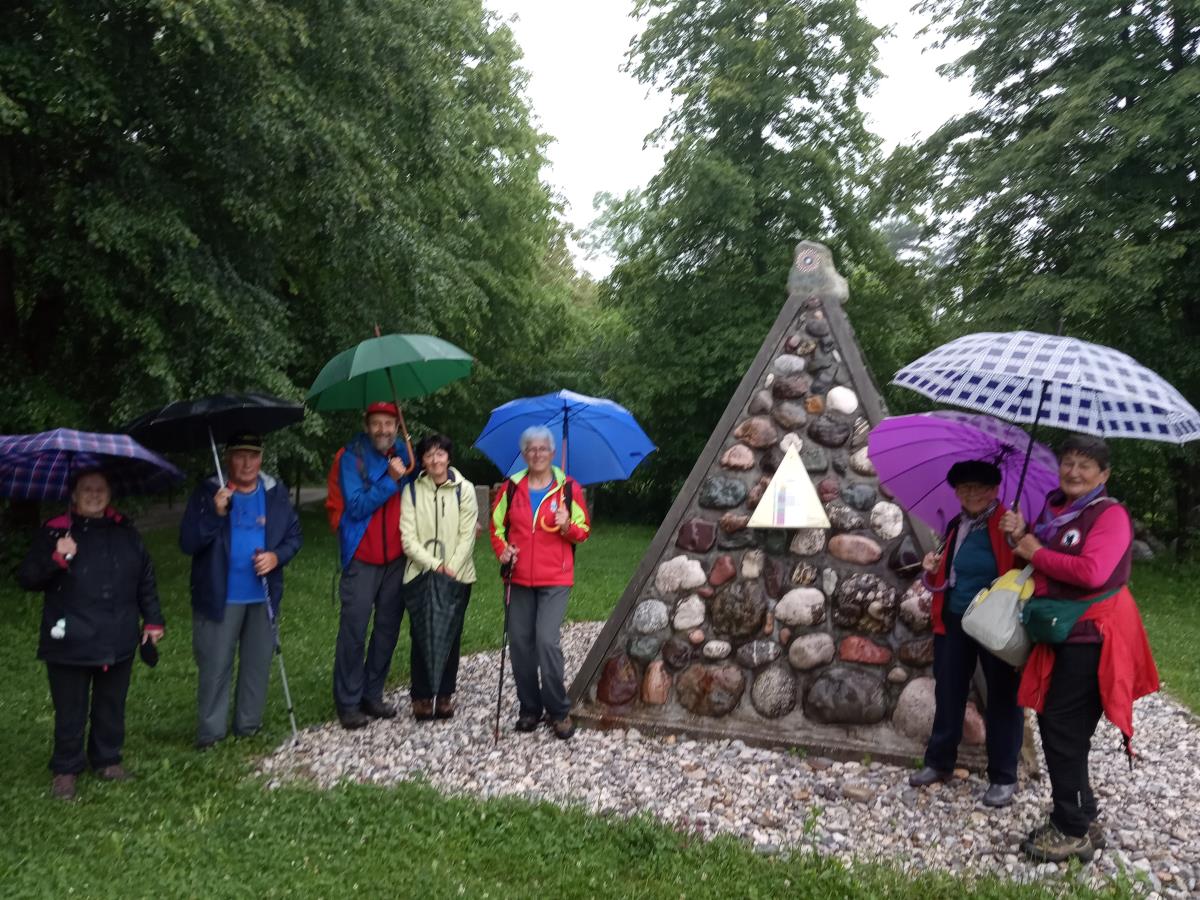 Dežnike smo razpeli že doma. Severna skupina je izpod dežnikov občudovala preddvorske in breške njive še zelenega, večinoma jarega ječmena. Bilke so se v brezvetrju samo malo tresle ob padanju dežja, ki jih je vseskozi oblival. Pogledi na čudovito, žametno zeleno obarvane njive, so nas navdajali k občudovanju in pogumu, kako vztrajati ob vsakem vremenu. Ob taki nezahtevni hoji se razvijejo prijateljski pogovori, ki sproščajo in nas še globlje povezujejo. Z Brega smo pot nadaljevali ob reki Kokri mimo Rape. Južna skupina treh pohodnic (verjetno je prav zaradi njih deževalo), se nam je na Rapi pri geološki piramidi priključila dobrovoljna in nasmejana. (Štiristrana geološka piramida prikazuje prodnike kokrških prodišč, ki izvirajo iz Kamniških Alp in Karavank. Njihova barvitost kaže na burno geološko preteklost, tako vsaka ploskev piramide prikazuje prodnike iz določene vrste kamnin) (vir Splet).
