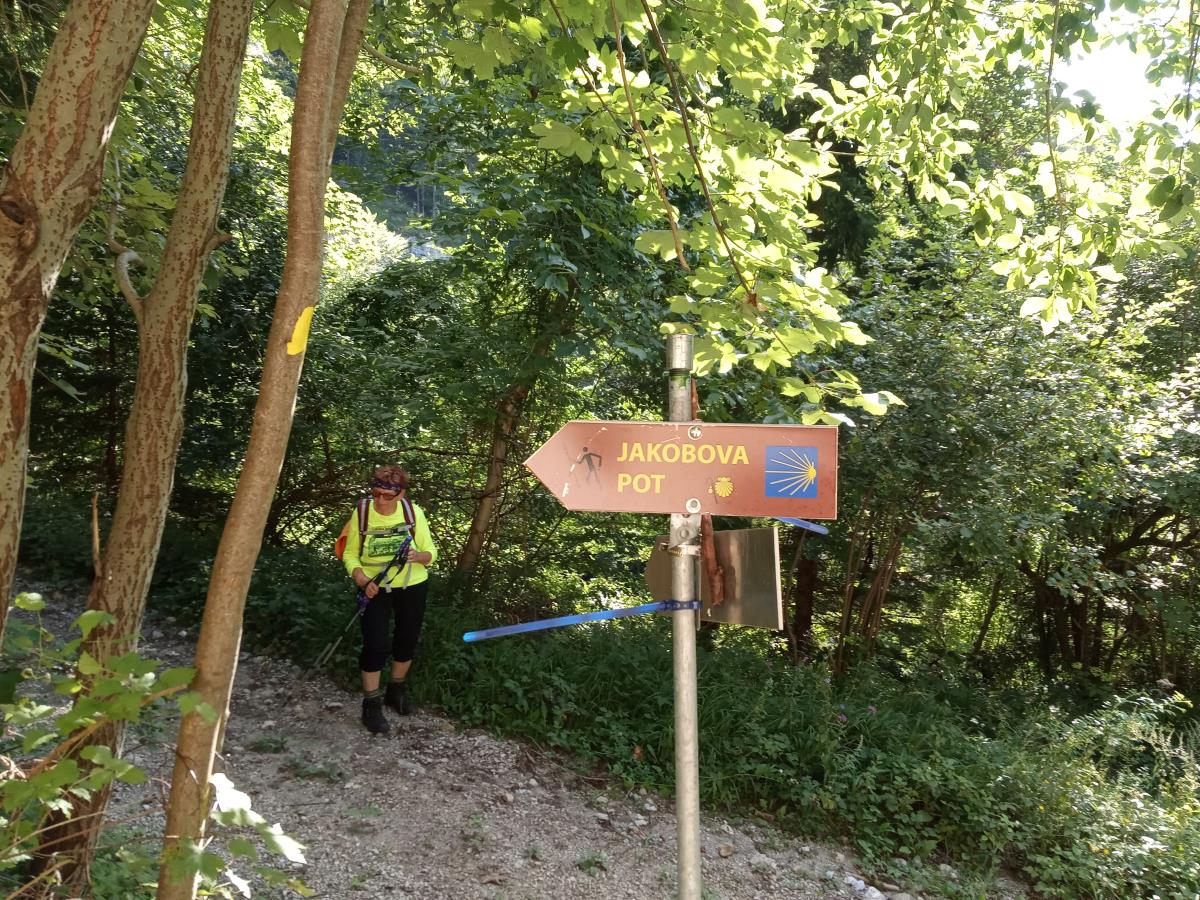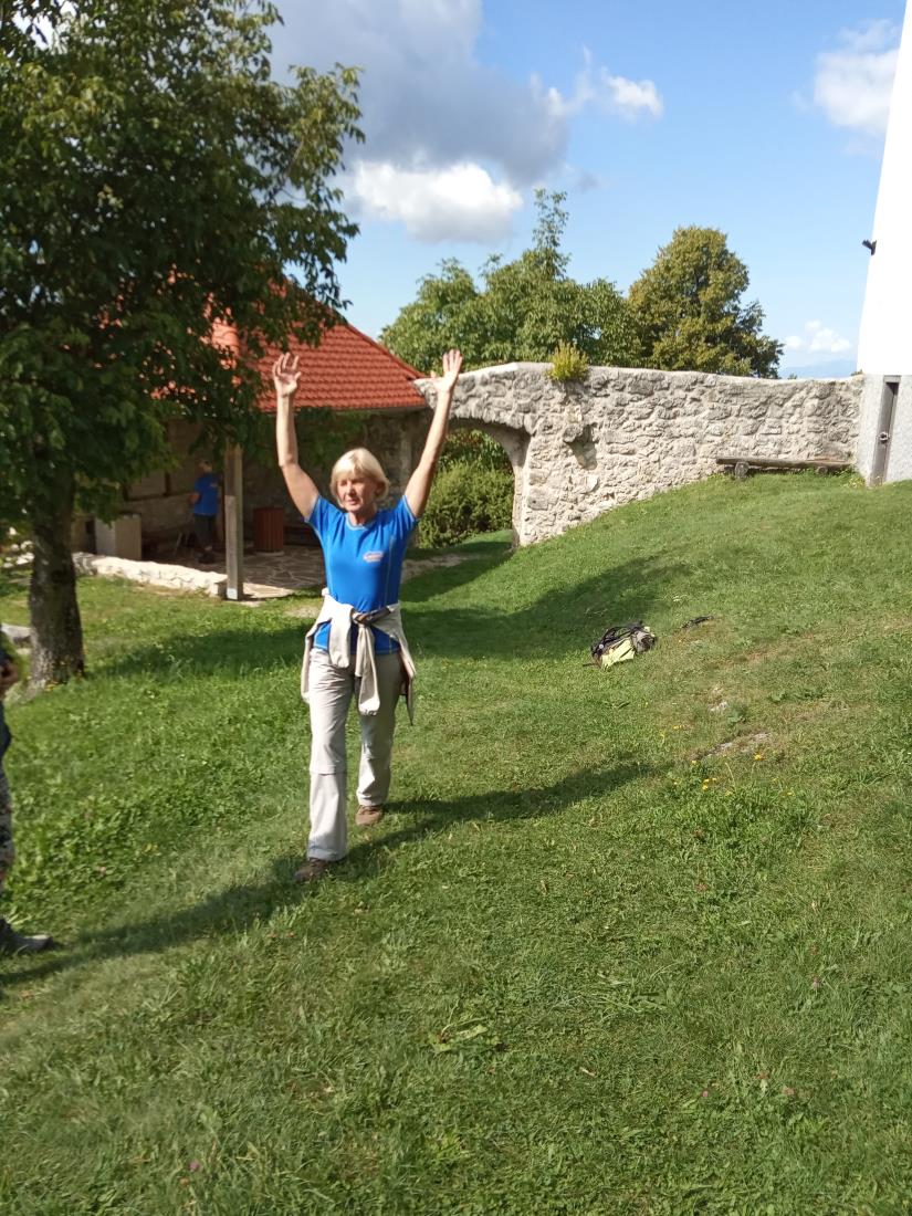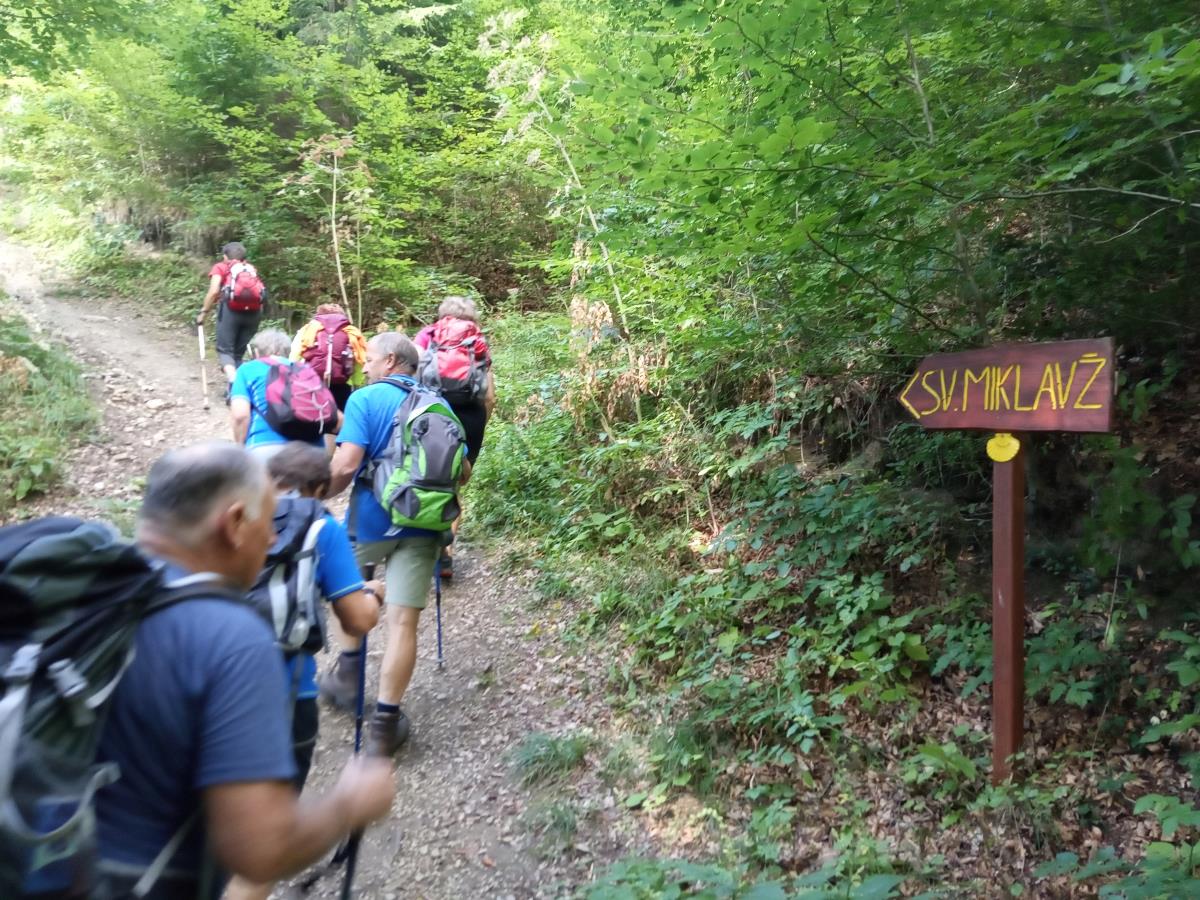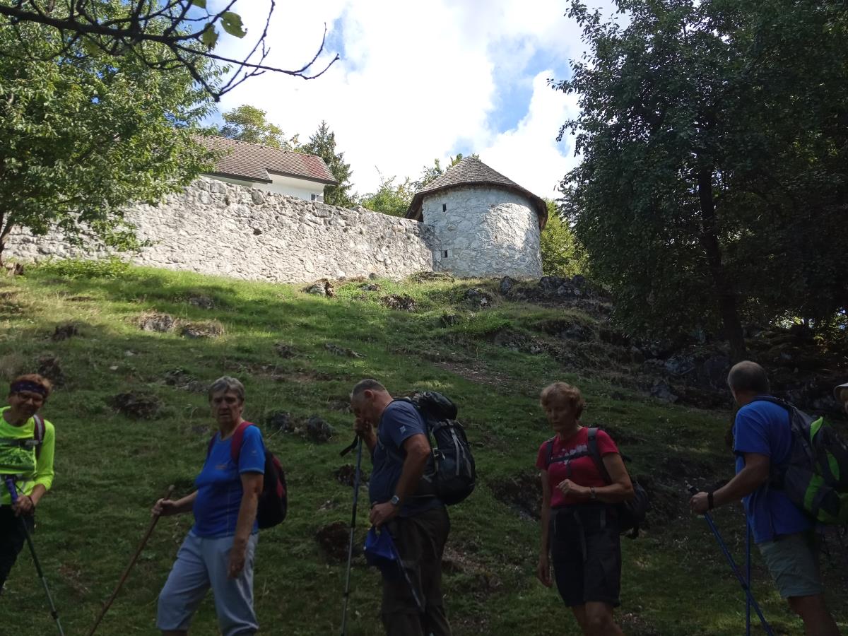 Skozi vas nas je pot vodila najprej do letnega gledališča KUD Šmartno, ki se nahaja v peskokopu na Gradišču. Minuto za kulturo je imela Francka. Od tu naprej smo se nekaj časa složno vzpenjali, nakar se je pot pri Jakobovi puščici, del poti smo hodili po slovenski Jakobovi poti, usmerila strmo v breg. Presenečeni smo bili tako nad strmino kot tudi nad kratkim časom, ko smo skozi drevje že ugledali cerkev. Kmalu sta se pokazala tudi obzidje in mežnarija. Posedli smo po klopeh in ob mizah ter si privoščili malico in daljši počitek. Tako kot je v letošnjem poletju zaradi corone že običaj, smo tudi na tem pohodu nazdravili zapoznelemu Franceskinemu rojstnemu dnevu in njeni vnučki Lari.