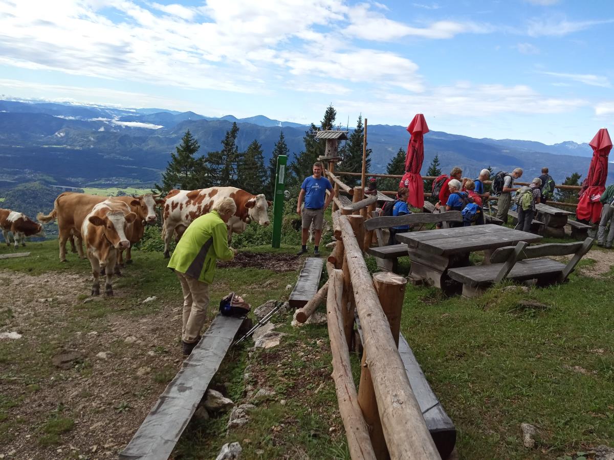 Vrnili smo se nazaj h koči, kjer sta nas že čakala kuhar in domačin Rok Jelovčan, Mimin vnuk, ki tu s strežbo planincem preživlja poletje. Kuhar in Rok sta se izkazala kot odlična gostitelja, koča pa je tudi uvrščena med naj slovenske koče. Postregla sta nam z dobro hrano in pijačo. Spet so bili med nami gostitelji, saj smo praznovali rojstni dan Ivke in Jožeta Sodnik ter Mimi Jelovčan, ki nas je dodatno nasmejala z upokojensko himno.