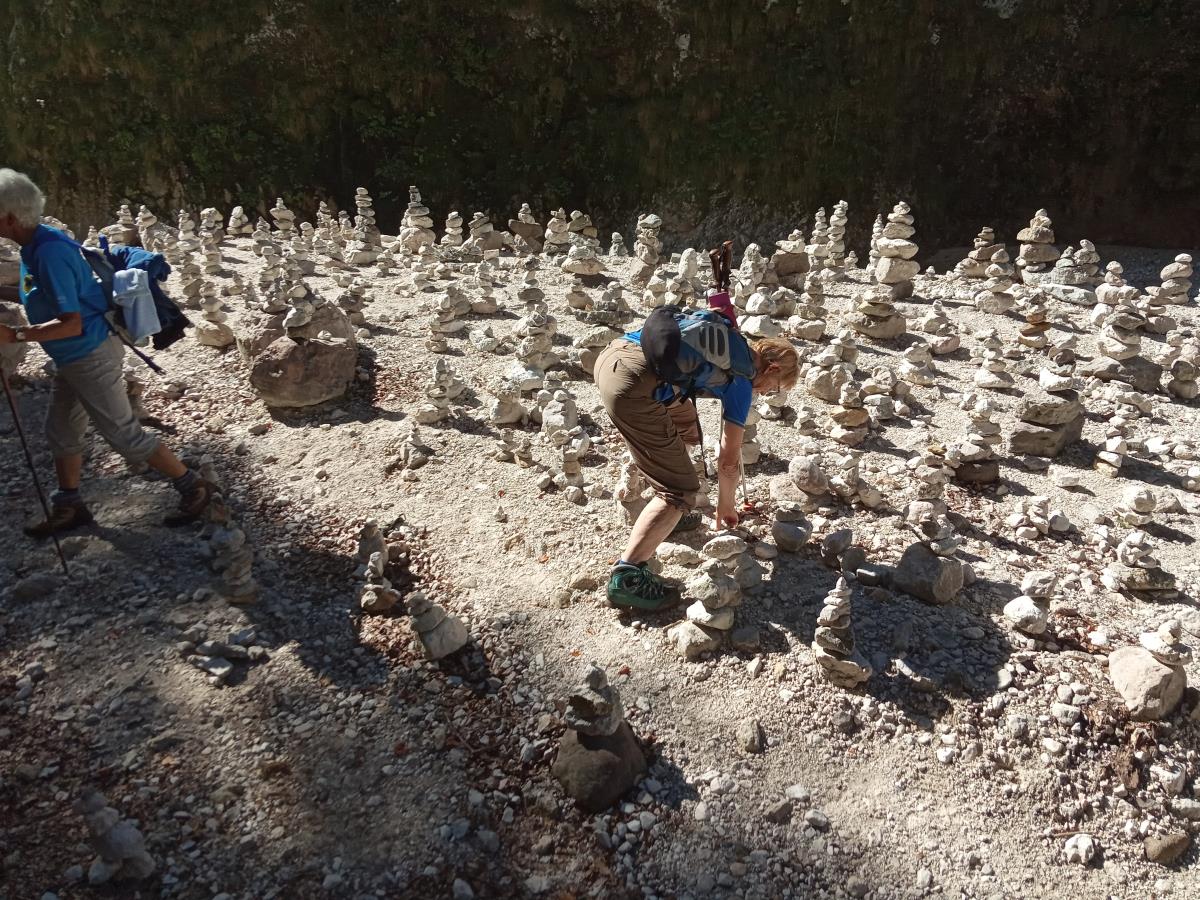 Sledili smo oznakam za Martuljške slapove. Pri prvem razcepu smo zavili desno proti Ingotovi brunarici, se vzpenjali po poti navkreber do odcepa levo proti Spodnjemu Martuljkovemu slapu. Pot se je spuščala strmo navzdol in zaradi mokrega terena zahtevala precej previdnosti. Zagledali smo vodni biser pred seboj. Voda na nadmorski višini 850 m pada čez 50 visoko steno in teče navzdol po 400 m dolgi in ozki apnenčasti Martuljkovi soteski. Ni nam preostalo drugega, kot da se še enkrat vzpnemo nazaj na kolovozno pot in levo nadaljujemo proti Ingotovi brunarici. Tu smo se ustavili, pomalicali, se slikali in predvsem ogledovali gorske vršace nad planino Jesenje. Pot smo nadaljevali naprej proti nekdanji Finžgarjevi kapelici, sedaj preimenovani v Kapelo Marije Snežne. Prečili smo potok in se obrnili nazaj proti Gozd Martuljku. Še drugič smo se spustili do Spodnjega Martuljkovega slapa in pot proti Gozd Martuljku nadaljevali po že omenjeni Martuljkovi soteski. Na mostu se je ob pogledu nazaj na slap, le ta pokazal v vsej svoji lepoti. Hodili smo desno ob soteski, občudovali vodovje in postavljene stožce in ob prihodu h kombijema predvsem visoko v nebo segajoči špičasti Špik.
