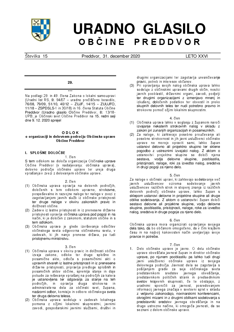 Odlok o organizaciji in delovnem področju Občinske uprave Občine Preddvor (Uradno glasilo Občine Preddvor - Številka 15/2020)
