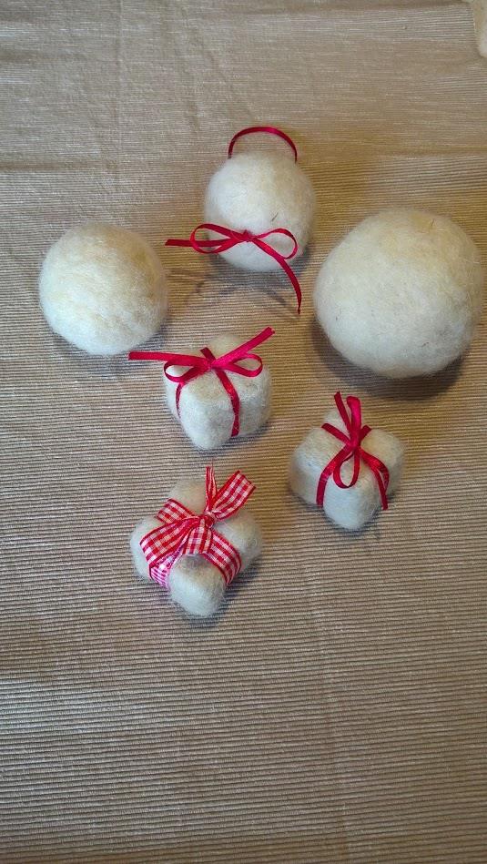 Osnovni material je bila česana volna jezersko-solčavske pasme. S tehniko suhega polstenja in posebno iglo smo izdelovali okraske. Obroč iz stiropora, ki je osnova venčka smo obdali z volno in jo s pomočjo igle pričvrstili nanj. Nekatere okraske smo izdelali na podoben način, drugi pa so bili povsem volneni. Zelo prikupne so volnene bunkice. Izdelava je povsem enostavna. Potrebovali smo nekaj česane volne, ki smo jo najprej z roko oblikovali v bunkico nato pa z iglo in pikanjem z vseh strani bunkico utrdili in na koncu skoznjo potegnili volneno prejo. Vsak se je lahko poigral po lastni zamisli in izdelal edinstven, povsem naraven in ročno narejen venček in okraske zanj.
