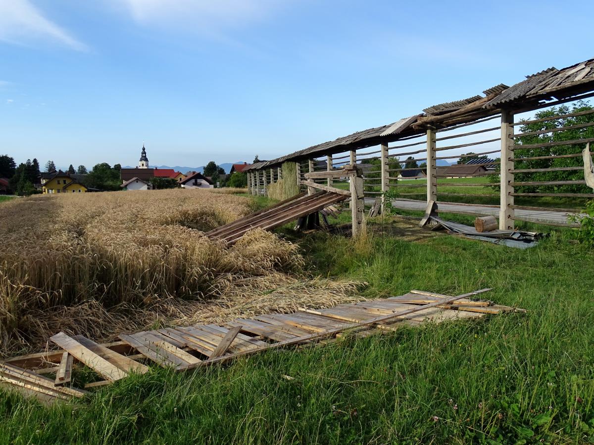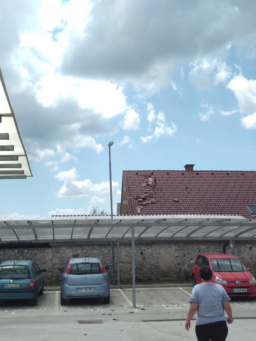 Včeraj je bil prava »groza« , ki je naju z Marjeto presenetila in prestrašila pri vrtnarjenju na vrtu. Nenadoma je zapihal močan veter, ki je raznesel pokošeno travo, nato se je nenadoma stemnilo, zagrnilo je sonce... Nastal je močan trušč in po zraku sta že vihrali štiri metrski pločevinasti strehi, ki sta pristali v Strnišovi koruzi. Hkrati se je z močnimi glasovi podirala Karvova šupa – nadstrešnica pri kozolcu. V zraku ob orkanskem vetru so bili vse mogoči predmeti. Komaj sva uspela priti, priplaziti in se pritajiti pod krošnjo jablane in čakati. Do vstopa v hišo zaradi vetra in predmetov v zraku še nisva mogla, nisva se smela premikati in vstopiti v hišo. Ko se je poleglo, sem si ogledal podrto nadstrešnico kozolca, tudi z iskanjem, če bi bil pri tem kdo prizadet, poškodovana naključno prisotna oseba, otrok… Ob tem je prišel iz vasi stanje pogledat tudi Strnišov Ivan in mimo se je pripeljal tudi Ogrin… Najbolje je pa »orkanski« dogodek opisala ga. Horvatova, najbližja soseda iz Preddvora. Ko je prišla do Karvovega kozolca je še vedno iskala, kaj se je zgodilo s traktoristom nad našo hišo. (Tako je namreč ropotalo v zraku.) Veter in bučanje pa je na hitro odšlo, kot je prišlo.